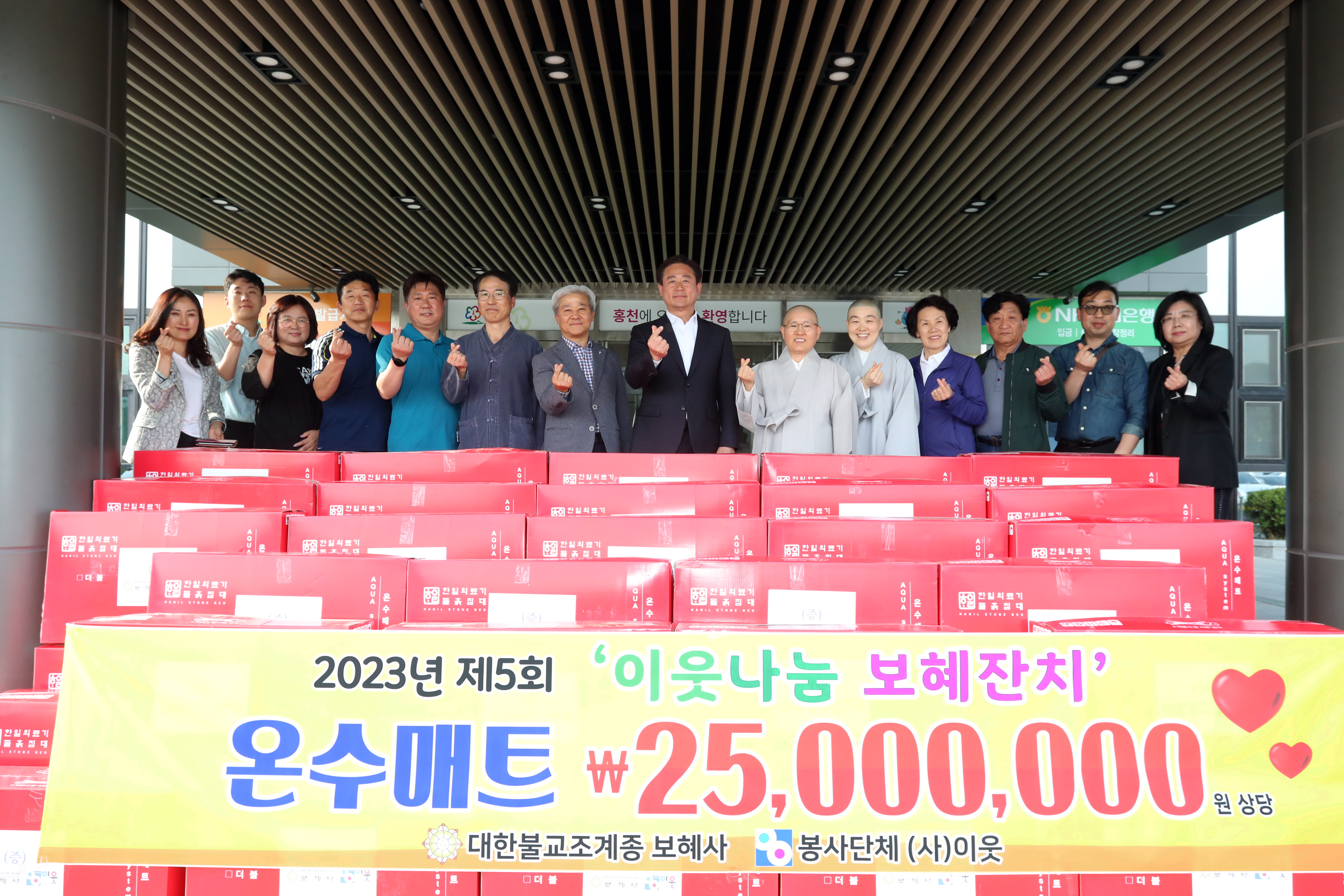 [강원사회복지신문 김도연 기자]=대한불교조계종 보혜사와 보혜사 신도회는 지난 5월 3일 봉사단체 (사)이웃과 함께 홍천군청을 방문, 소외계층 어르신 100명에게 2,500만원 상당의 온수매트를 기탁했다. 이날 기탁식에는 신영재 홍천군수, 김은순 복지과장, (사)이웃 박학천 이사장과 강대규 사무국장, 보혜사 지만 주지스님...