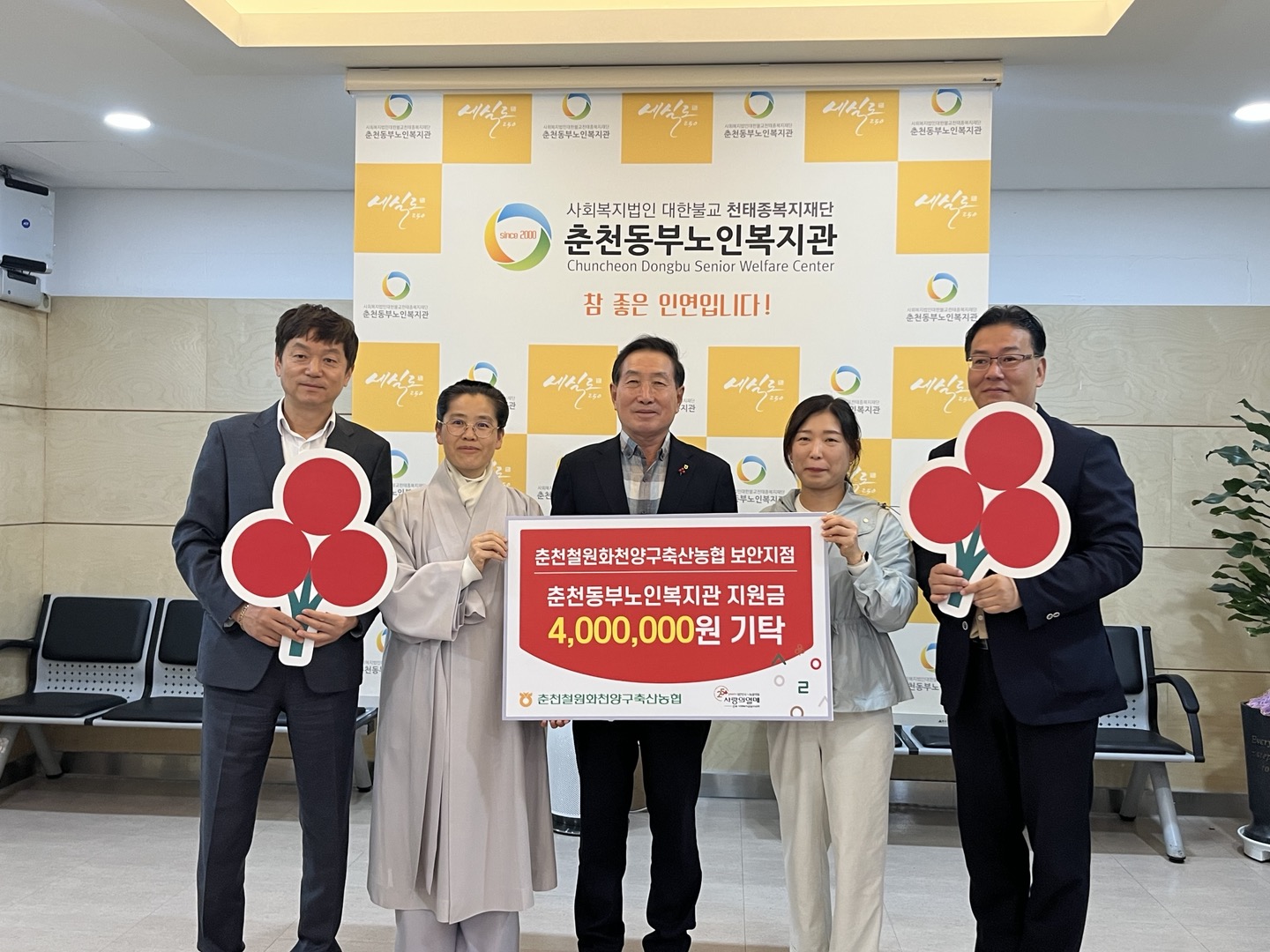 [강원사회복지신문 홍기한 기자]=춘천철원화천양구축산농협 보안지점(조합장 이중호)에서 지난 4월 26일 오전 10시 춘천동부노인복지관(관장 종세스님)을 방문하여 강원 사회복지공동모금회를 통해 후원금(금4,000,000원)을 전달했다. 춘천철원화천양구축산농협 보안지점은 춘천동부노인복지관과 지속적인 교류를 통해 지역복...