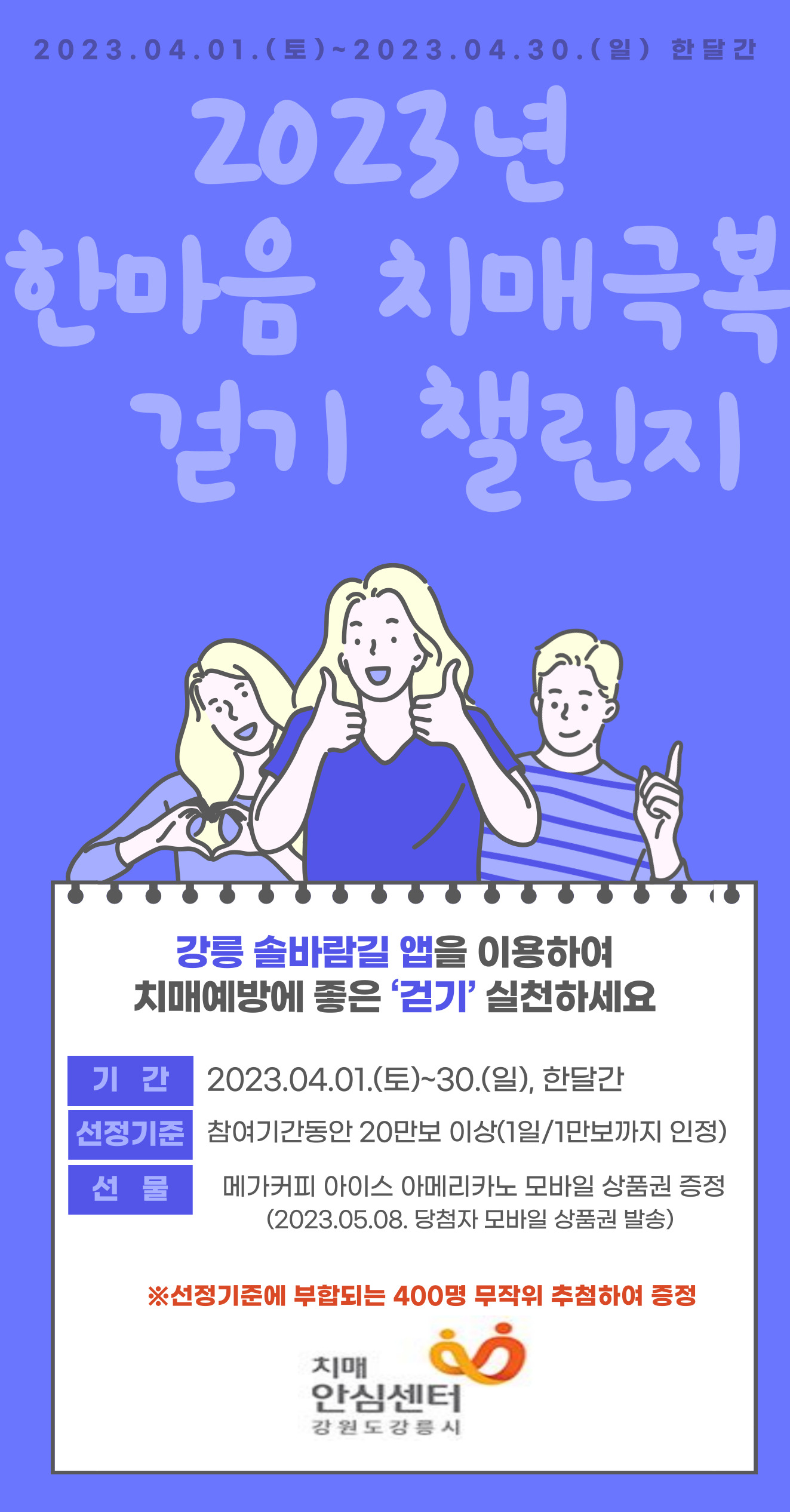 [강원사회복지신문 김도연 기자]=강릉시 보건소 치매안심센터는 치매예방에 좋은 '걷기'를 실천하고, 치매극복 캠페인을 확산하기 위한 '제6회 한마음 치매극복 걷기행사'를 개최한다. 2018년부터 진행된 강릉시 한마음 치매극복 걷기행사는 걷기에 관심 있는 강릉시 주민이면 누구나 모바일 앱 '워크온'을 통해 참여 가능하...