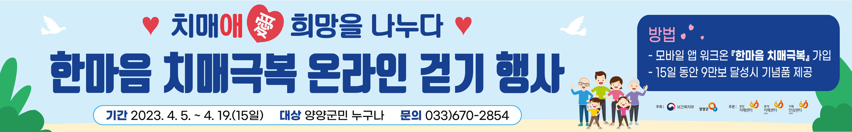 [강원사회복지신문 김종한 기자]=양양군 보건소는 지난 4월 5일부터 오는 4월 19일까지 15일 동안 9만보 걷기, '2023년 한마음 치매극복 온라인 걷기 행사'를 운영한다. 이번 '치매애(愛) 희망을 나누다' 걷기행사는 치매 인식개선으로 치매에 대한 편견을 불식시켜 치매와 더불어 살아갈 수 있는 사회적인 공감대 형성을 위...