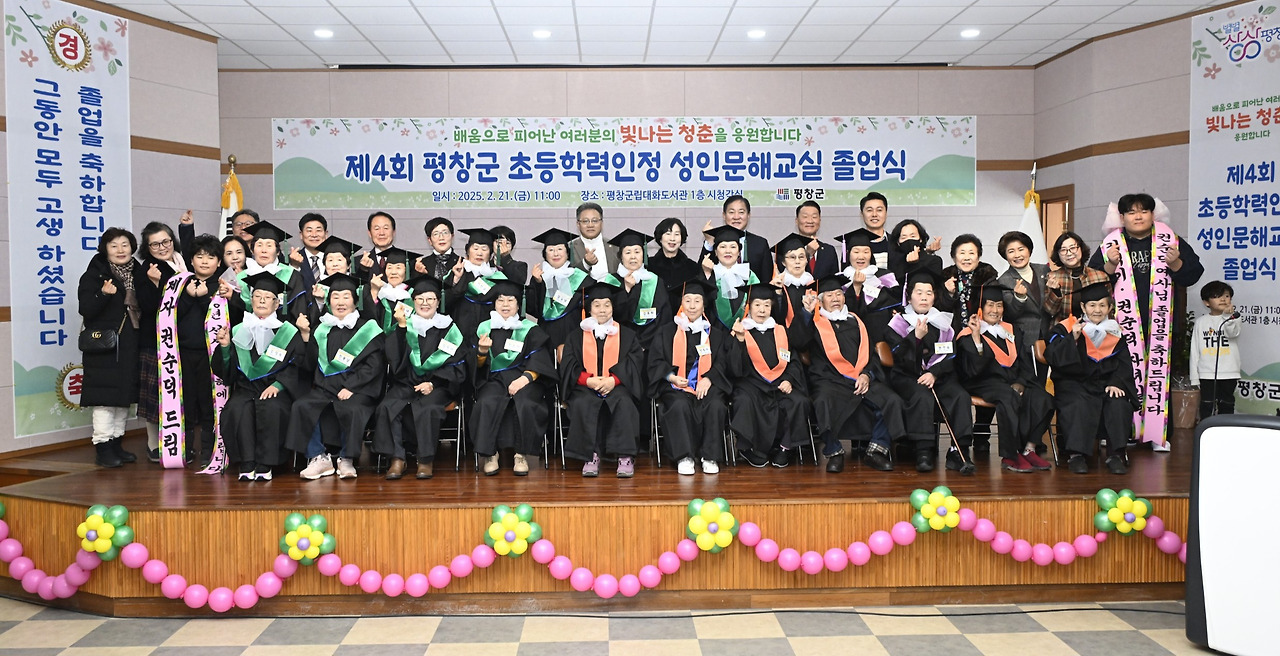 평창군은 2월 21일 오전 11시 평창군립대화도서관에서 제4회 초등 학력 인정 성인문해교실 졸업식을 개최했다. 졸업식은 대화면 평생학습센터의 축하공연을 시작으로 초등 학력 인정서 전달식과 상장 수여, 축사, 졸업 영상 상영, 기념 촬영 순으로 진행됐으며 학습자의 가족이 참석해 그동안 배움을 위해 노력한 졸업생을 함...