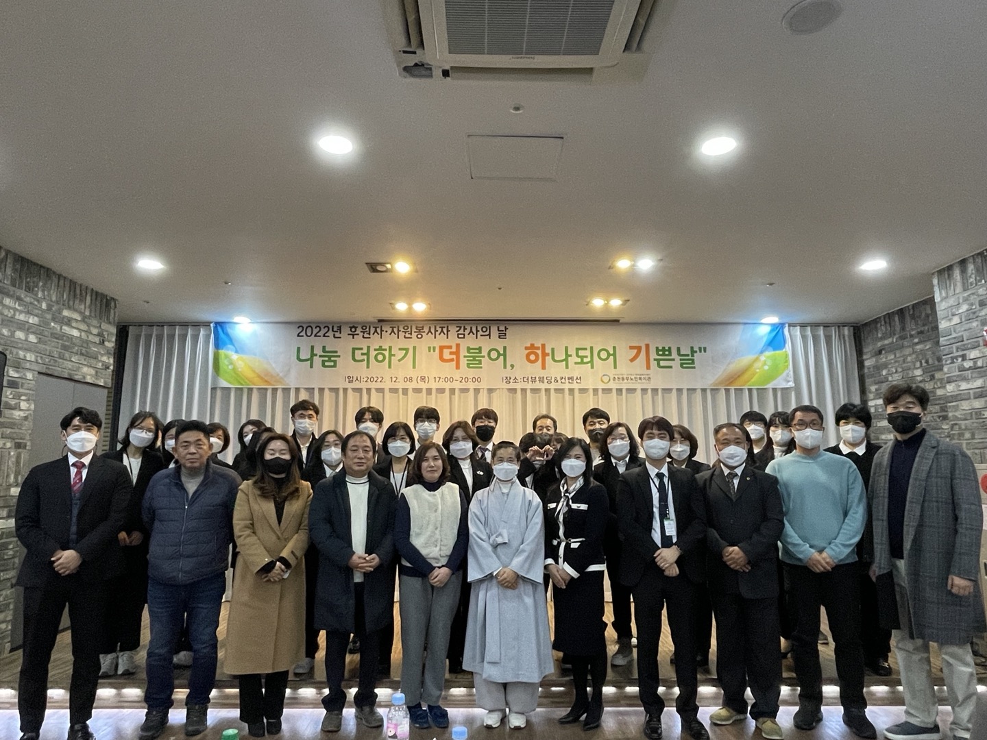 [강원사회복지신문 홍기한 기자]=춘천동부노인복지관이 2022년 자원봉사자&후원자 감사의 날 나눔더하기 행사를 더뷰웨딩홀에서 지난 12월 8일 개최했다. 나눔더하기 '더불어 하나되어 기쁜날'이라는 행사 제목 아래 천태종복지재단 강원북부분사무소 정월중 스님, 이창우 춘천부시장, 김진호 춘천시의회의장 외 200여명...