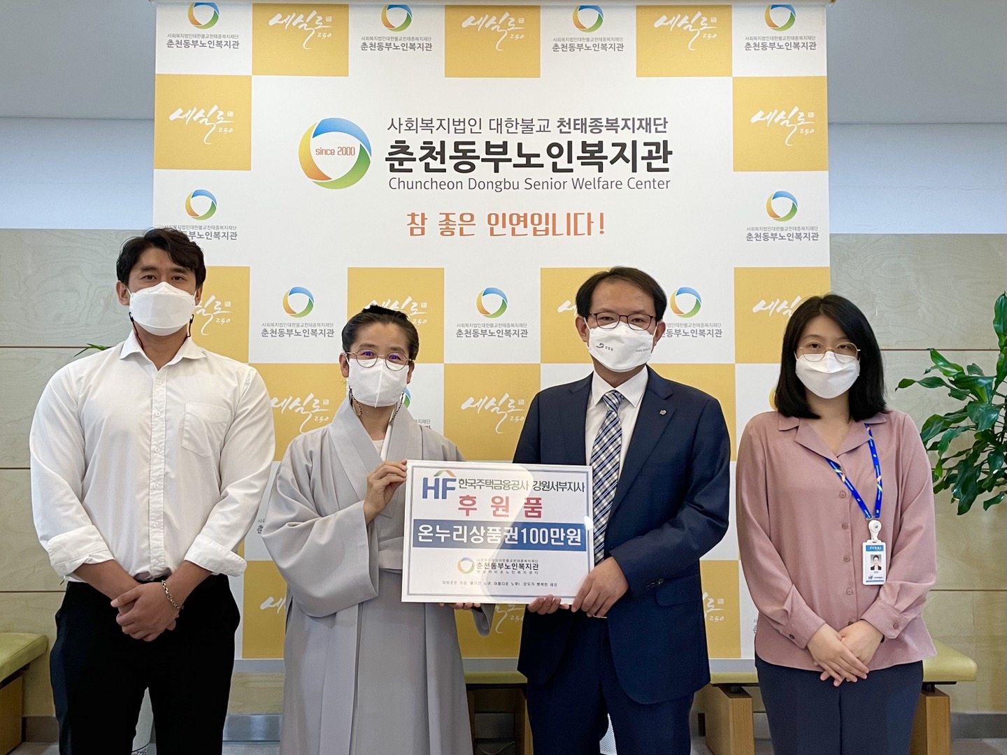 [강원사회복지신문 이정환 기자]=한국주택금융공사 강원서부지사는 춘천동부노인복지관에 1백만원 상당의 온누리 상품권을 전달했다. 이번 후원금은 춘천시의 어르신들을 위해 다양한 복지 서비스의 모습으로 사용될 예정이다. 후원금 전달식에 참석한 한국주택금융공사 강원서부지사 전경환 지사장은 "앞으로도 지속적인 후...