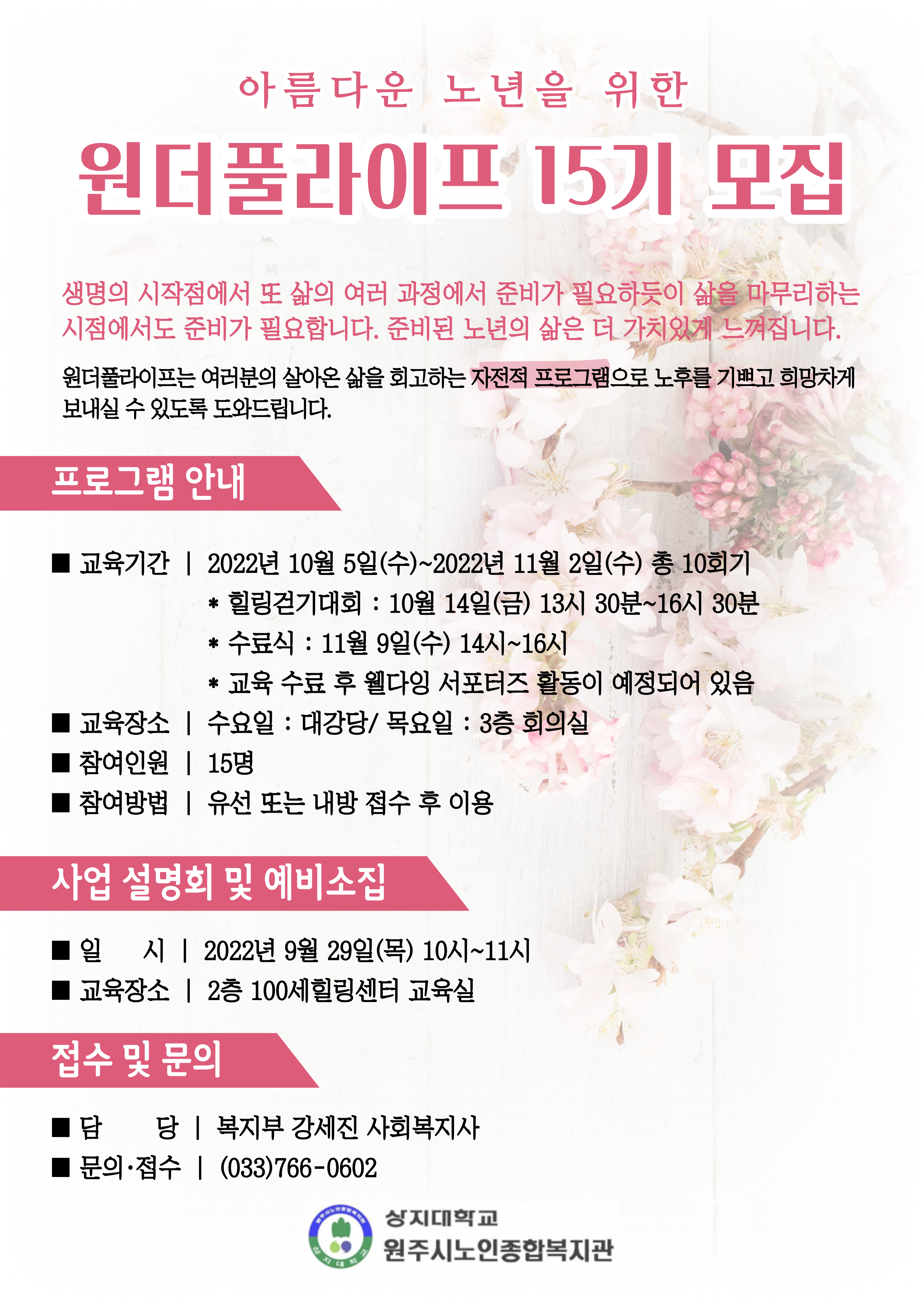 [강원사회복지신문 서은진 기자]=원주시노인종합복지관(관장 용석찬)에서는 웰다잉 프로그램 '아름다운 노년을 위한 원더풀라이프 15기'를 모집하여 오는 10월 5일(수)부터 진행한다. 원더풀라이프 프로그램은 원주시노인종합복지관에서 15년째 진행되는 장수 프로그램으로 아기의 탄생을 준비하듯 인생의 마무리하는 시점에...