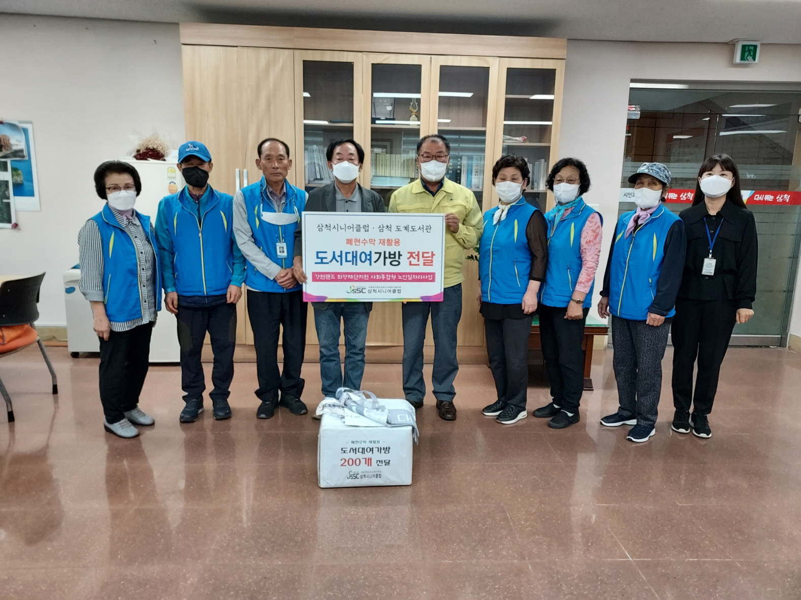[강원사회복지신문 이정환 기자]=삼척시니어클럽(관장 김성래)은 지난 8월 30일 삼척시 도계읍행정복지센터(읍장 김회영)에서 폐현수막을 이용하여 제작한 도서용 가방 200점을 도계도서관에 기증하는 전달식을 가졌다. 삼척시니어클럽은 지난해에도 50점을 기증하여 도서관을 이용하는 주민들에게 배포하였는데, 호응도가 높...