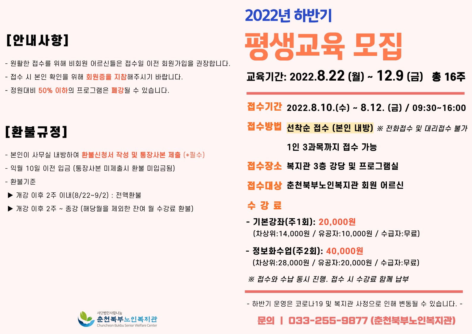 [강원사회복지신문 이정환 기자]=춘천북부노인복지관(관장 박재호)은 오는 8월 10일부터 12일까지 하반기 평생교육프로그램을 수강생을 모집한다고 밝혔다. 하반기 교육과정은 8월 22일부터 12월 9일까지 총 16주이다. 개설과목은 △건강체조 △실버요가 △한글서예 △한문서예 △캘리그라피 △동양화 △수채화 △한국현대사...