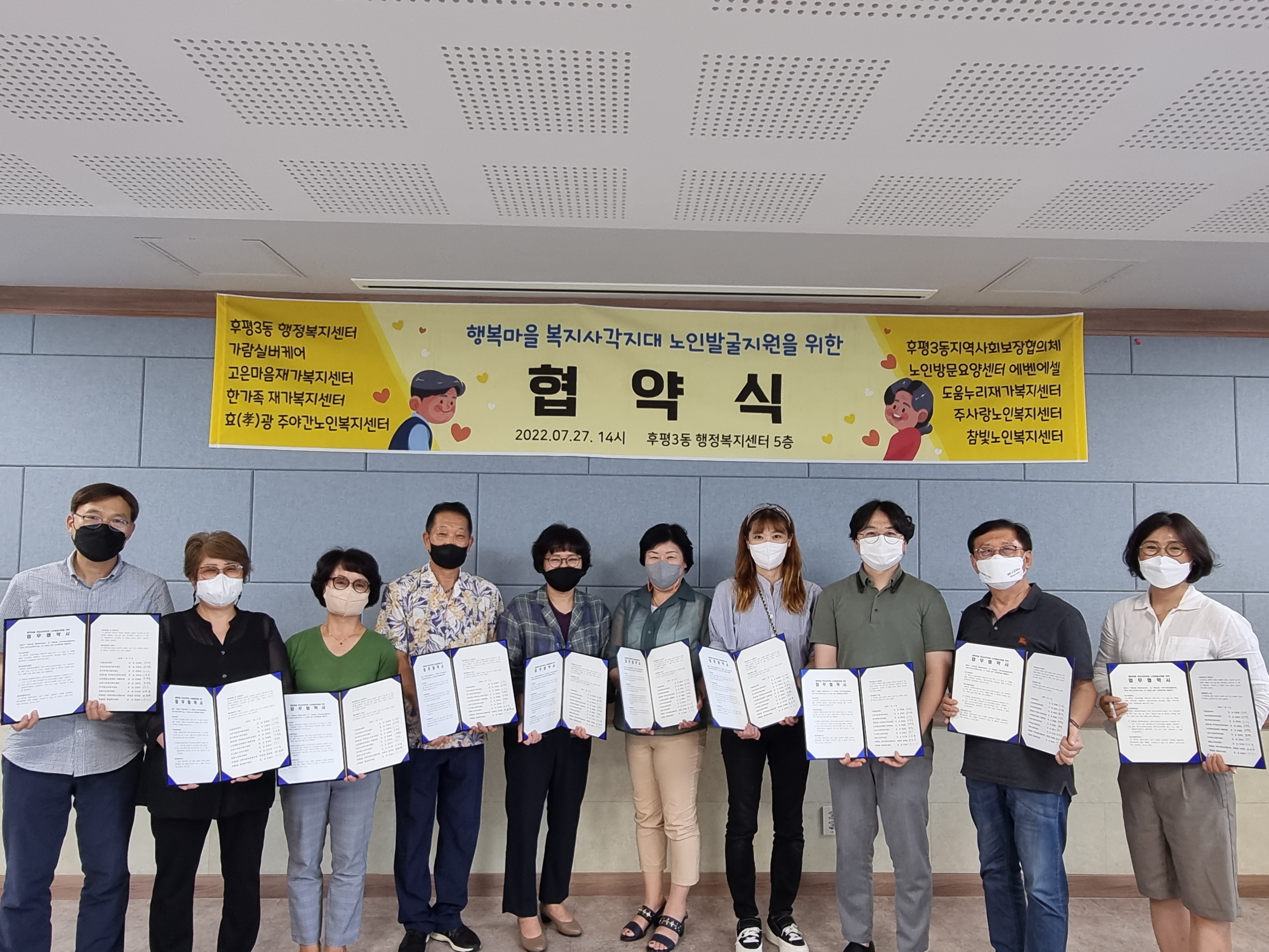[강원사회복지신문 홍기한 기자]=춘천시 후평3동 행정복지센터는 최근 지역사회보장협의체, 관내 재가 노인복지시설 8개소와 저소득 취약계층 독거노인에 대한 복지서비스 제공 및 지역 복지사각지대 위기 노인발굴 활성화를 위한 업무 협약식을 가졌다.