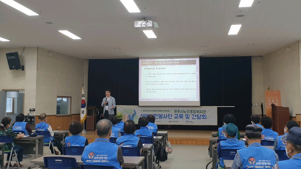 [강원사회복지신문 서은진 기자]=원주시노인종합복지관(용석찬 관장)은 지난 8월 3일 선배시민봉사단의 지역사회 활동 연계를 위한 활동교육을 실시하였다. 이날 교육은 전) 한국보훈복지의료공단 관리이사을 역임하고 현재 라이프케어 이종협동조합연합회 사무총장으로 활동 중인 최혁진 사무총장의 교육 진행으로 사회혁신...
