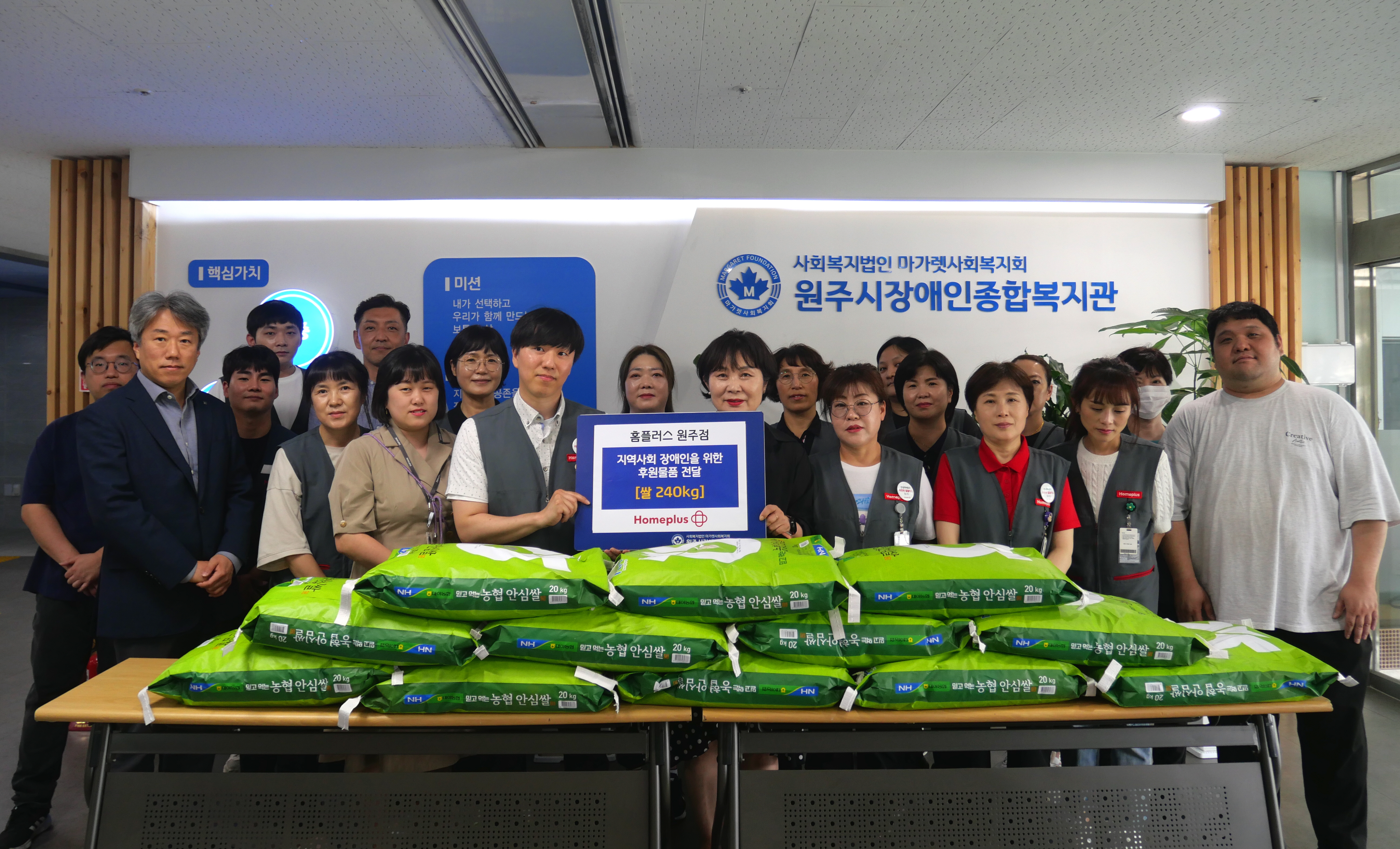 2024년 6월 17일 월요일, 홈플러스 원주점(점장 황성국)은 지역사회의 장애인들을 지원하기 위해 원주시장애인종합복지관(관장 정진애)에 쌀 240kg를 후원하였다. 홈플러스 원주점 황성국 점장은 “지역사회의 일원으로서 소외된 이웃들에게 조금이나마 도움이 되고자 이번 후원을 결정했다”며 “앞으로도 지역사회와 상생하...