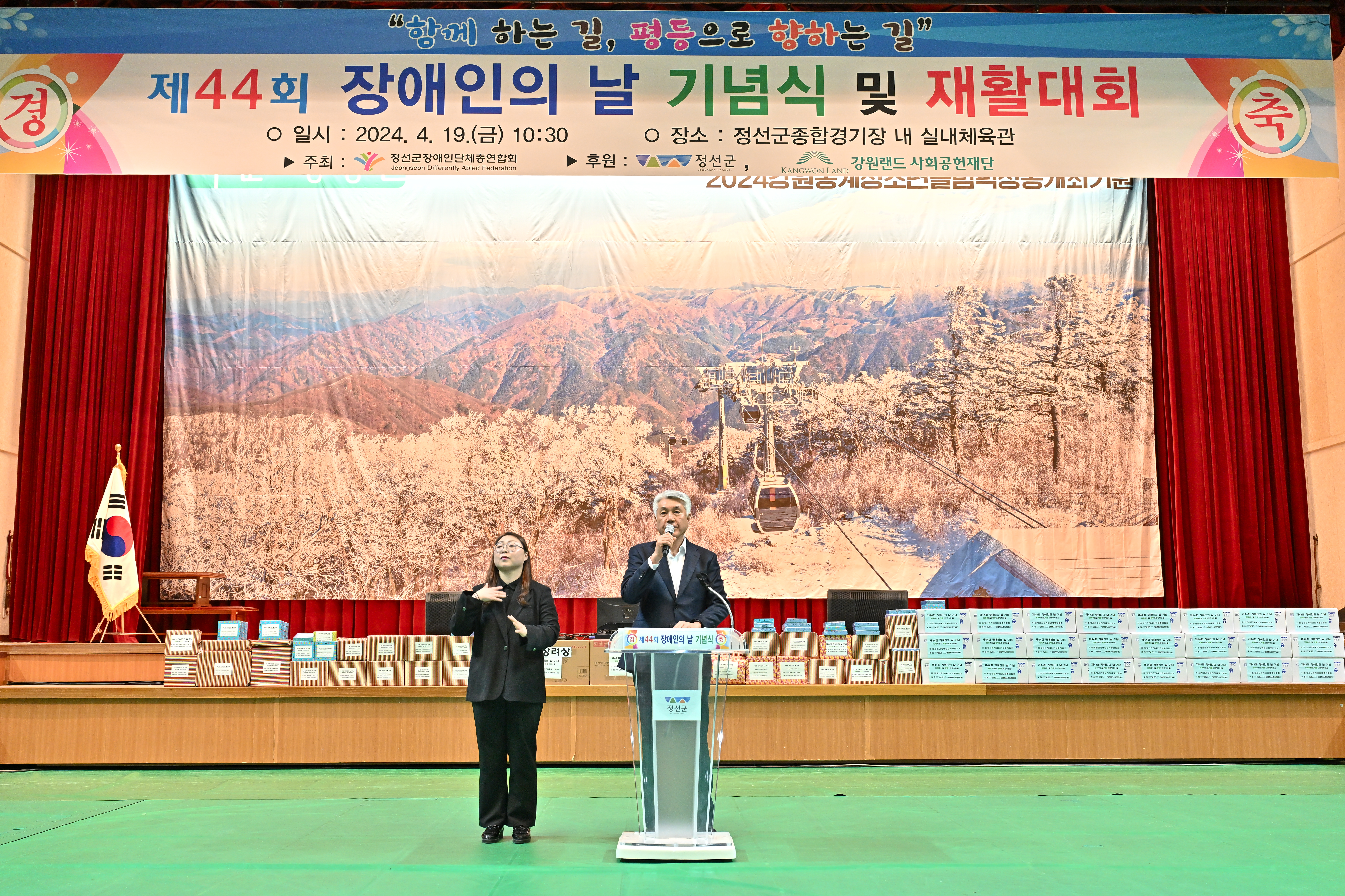 정선군(군수 최승준)에서는 지난 4월 19일 정선종합경기장 실내체육관에서 정선군장애인단체 총연합회(회장 김준영) 주관으로 ‘제44회 장애인의 날 기념행사’를 개최했다. 이날 행사에는 최승준 정선군수를 비롯한 지역 기관·사회단체장, 장애인 가족, 자원봉사자 등 800여 명이 참석한 가운데 정선군립아리랑예술단, 손메...