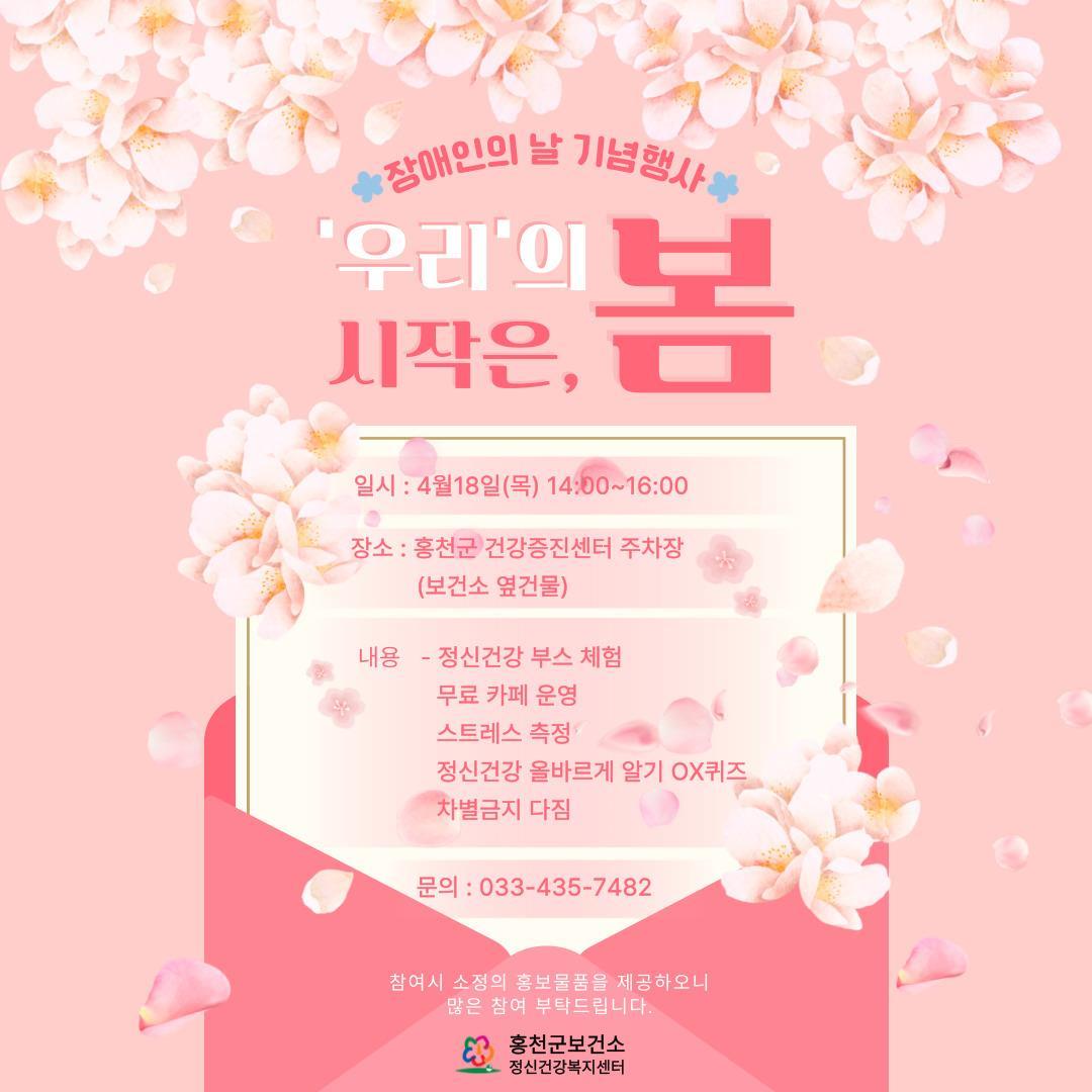 홍천군(군수 신영재)은 장애인의 날을 맞아 정신장애인 인식개선 홍보를 위해 오는 4월 18일 ‘우리 시작은, 봄’ 행사를 추진한다. 이번 행사는 홍천군정신건강복지센터 주관으로 정신장애인에 대한 인식 개선을 홍보하고 걷기를 통해 장애인과 비장애인 모두가 함께하는 지역 사회를 응원하고자 마련됐다. 또한 행사장에서...
