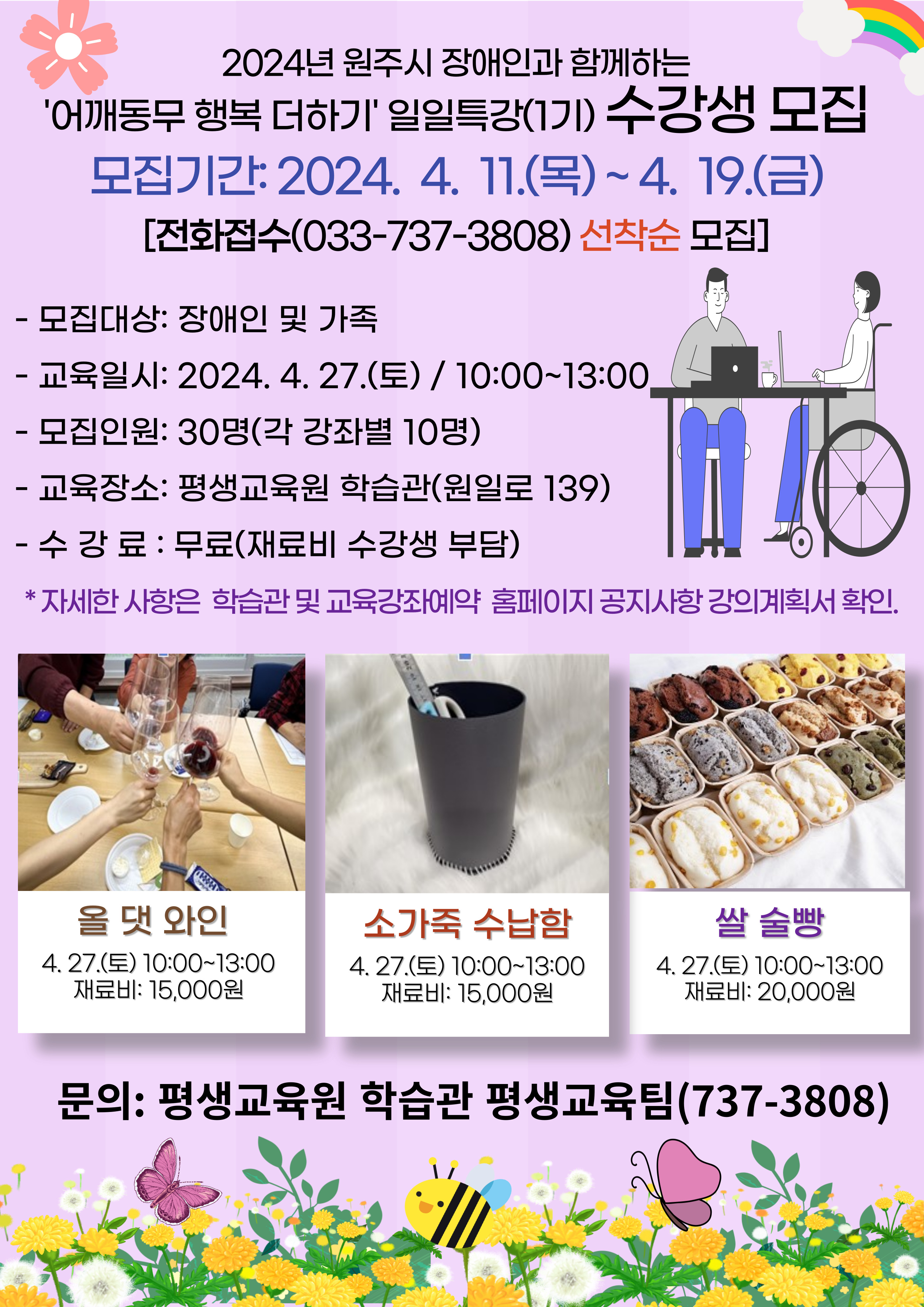 4월 11일부터 19일까지 강좌별 10명씩 전화접수(선착순) 30명 모집 평생교육원 학습관은 4월 11일부터 19일까지 장애인 및 가족을 대상으로 장애인과 함께하는‘어깨동무 행복 더하기’일일특강 1기 수강생을 모집한다. 강좌별 10명씩 선착순 30명을 모집하며, 학습관 평생교육팀으로 전화(☎033-737-3808) 접수가 가능하다....