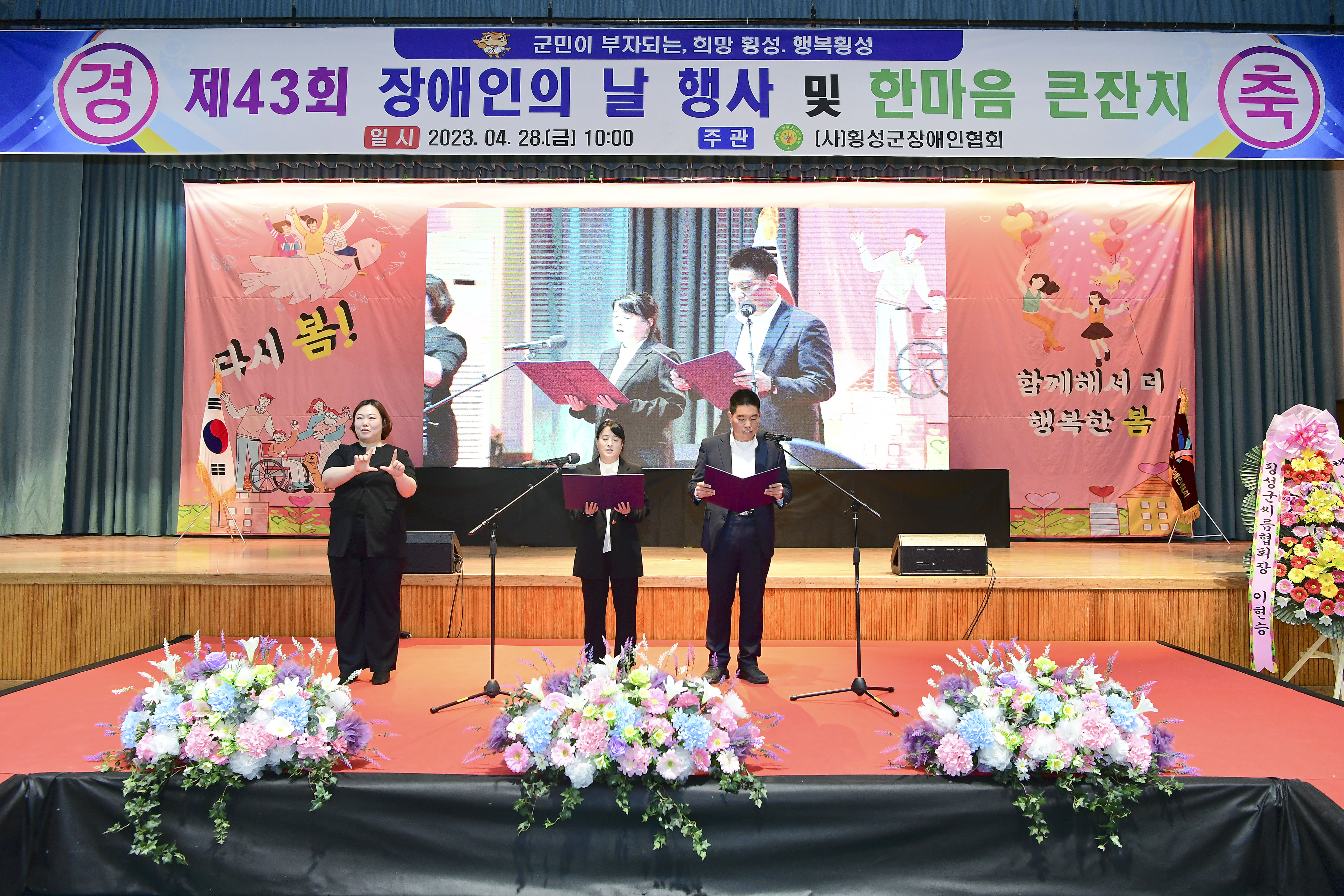 [강원사회복지신문 홍기한 기자]=횡성군은 지난 4월 28일, 횡성군장애인협회 주관으로 횡성종합운동장 실내체육관에서 '제43회 장애인의 날 기념식 및 한마음 큰잔치' 행사를 개최했다. '차별은 없이, 기회는 같이, 행복은 높이'라는 주제로 열린 행사는 1부 기념식과 2부 명랑운동회로 나누어 진행하였다. 기념식에서는 △축...