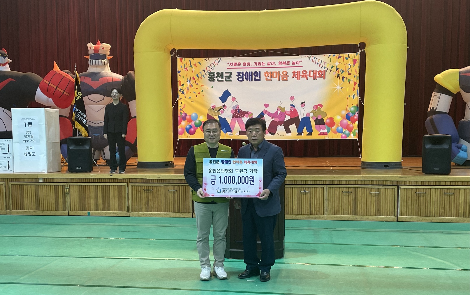 [강원사회복지신문 김도연 기자]=홍천군장애인복지관(관장 허종국)은 지난 4월 26일(수) 홍천군종합체육관에서 홍천관내 장애인을 대상으로 한마음 체육대회를 진행하였고, 체육대회를 맞이하여 권선개발과 홍천읍번영회에서는 뜻깊은 후원금 전달식이 진행되었다. 권선개발(회장 이종심)은 삼백만원(3,000,000원)을 홍천군 ...