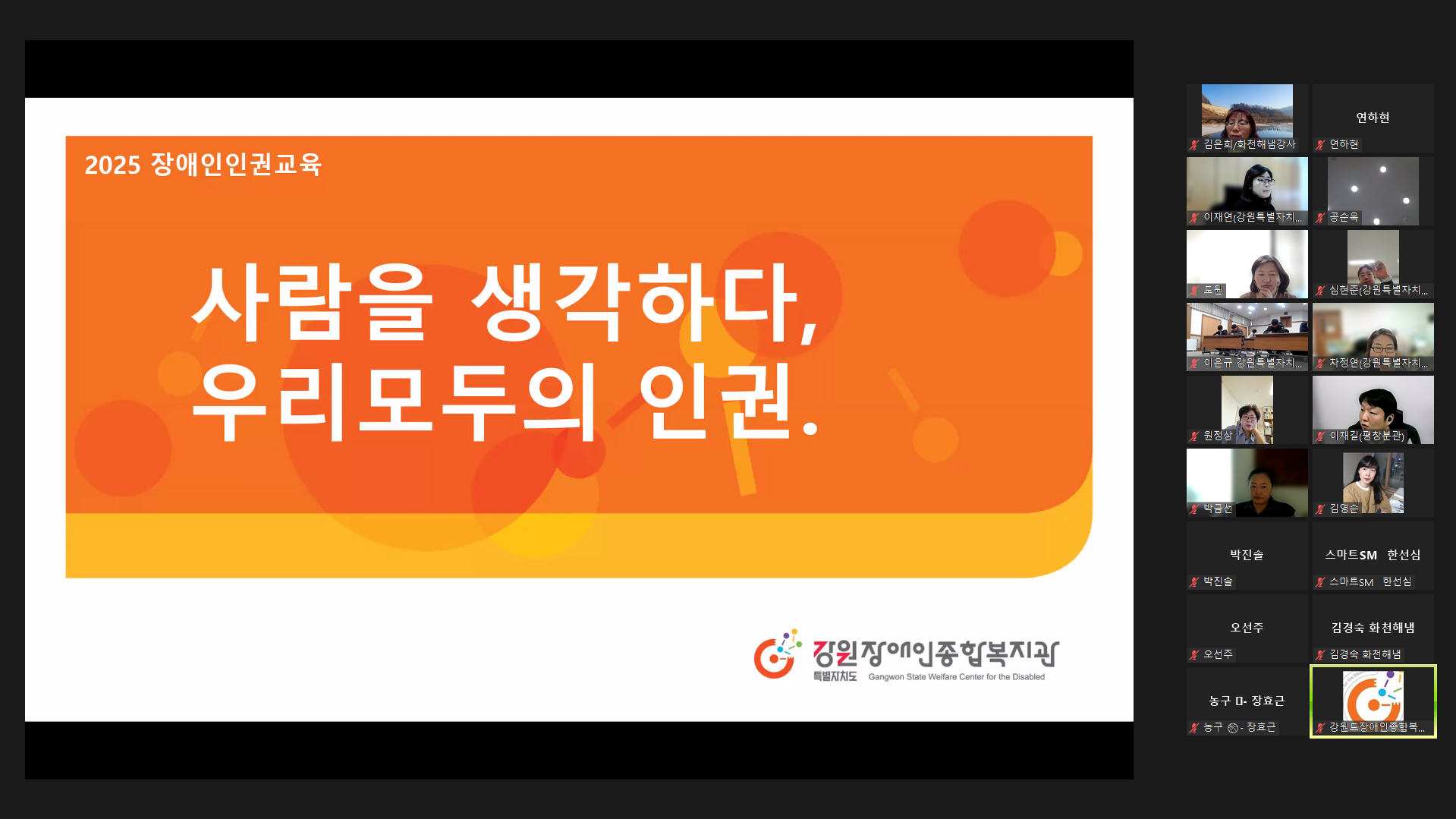 강원특별자치도장애인종합복지관(관장:엄정호)에서는 2월 27일(목), 온라인 실시간 회의 플랫폼(ZOOM)을 활용하여 춘천 본관, 속초/평창/철원 분관, 양구/화천 지역사회중심지원센터에서 강사로 활동하는 프로그램 강사를 대상으로 장애인인권교육을 진행하였다. 기획연구팀 박진솔 과장이 강사로 참여한 2025년 프로그램 강...