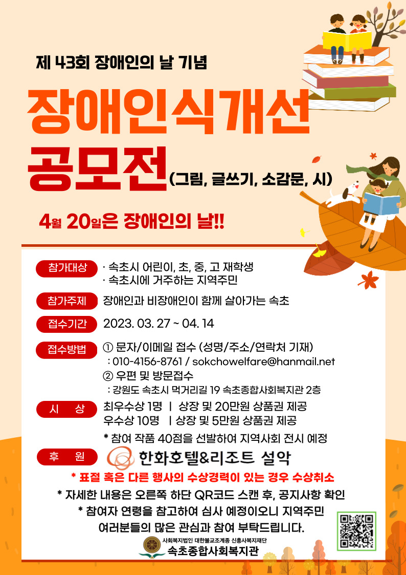 [강원사회복지신문 김도연 기자]=속초종합사회복지관(관장 : 성연)에서는 4월 20일 장애인의 날을 맞아 3월 27일부터 4월 14일까지 지역주민을 대상으로 '2023년 장애인식개선 공모전'을 진행한다. 공모전은 '장애인과 비장애인이 함께 살아가는 속초'라는 주제로 장애인에 대한 편견과 선입견 해소를 위한 그림, 글쓰기, 소...