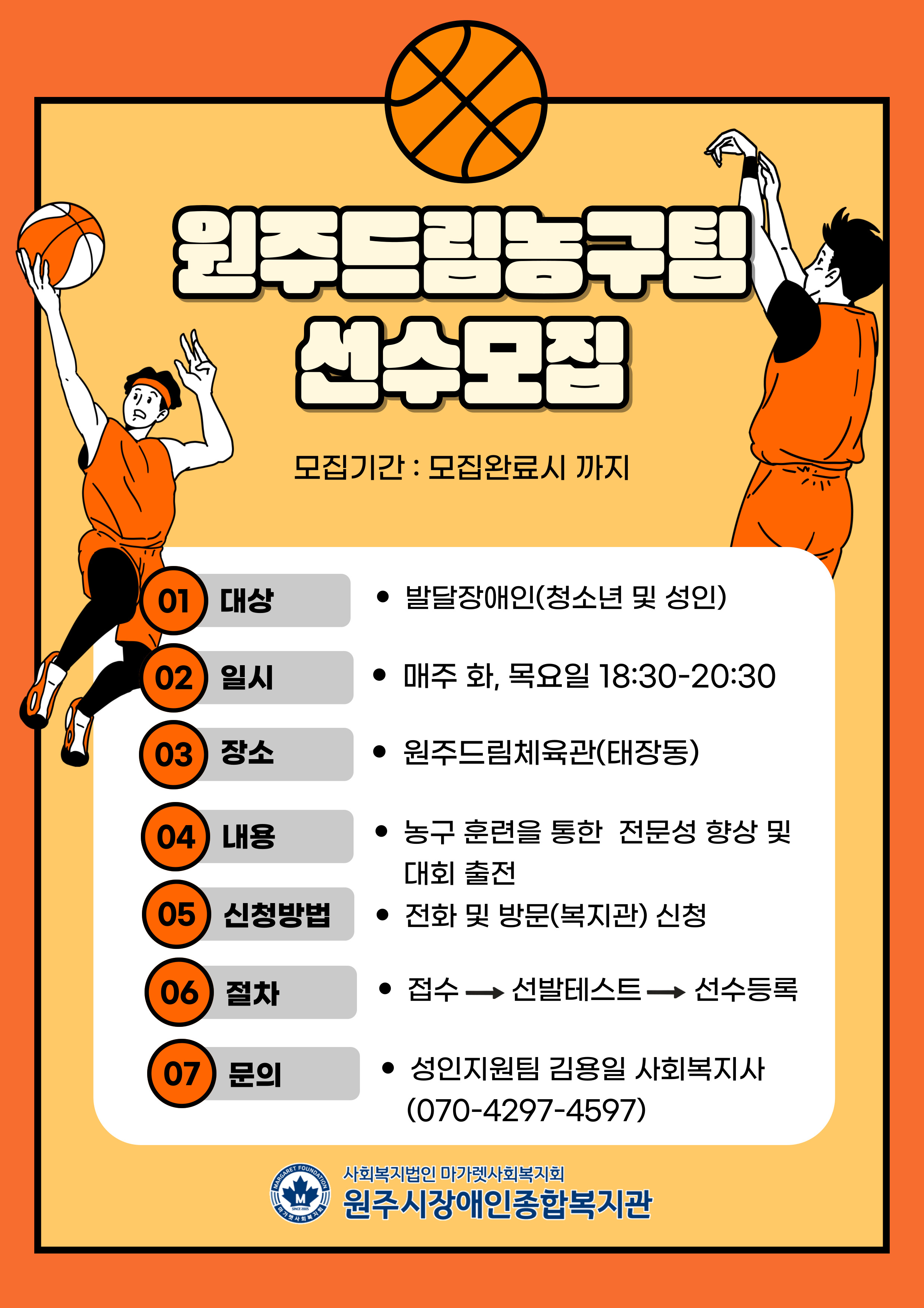 원주시장애인종합복지관(관장 정진애)은 발달장애인 청소년과 성인으로 구성된 원주드림농구팀의 신규 참여자를 상시 모집한다. 원주드림농구팀은 원주드림체육관에서 매주 화요일, 목요일 18시 30분에 훈련을 실시한다. 원주드림농구팀은 2023년, 2024년 강원특별자치도장애인생활체육대회 2위를 수상한 바 있다. 신규 참여...