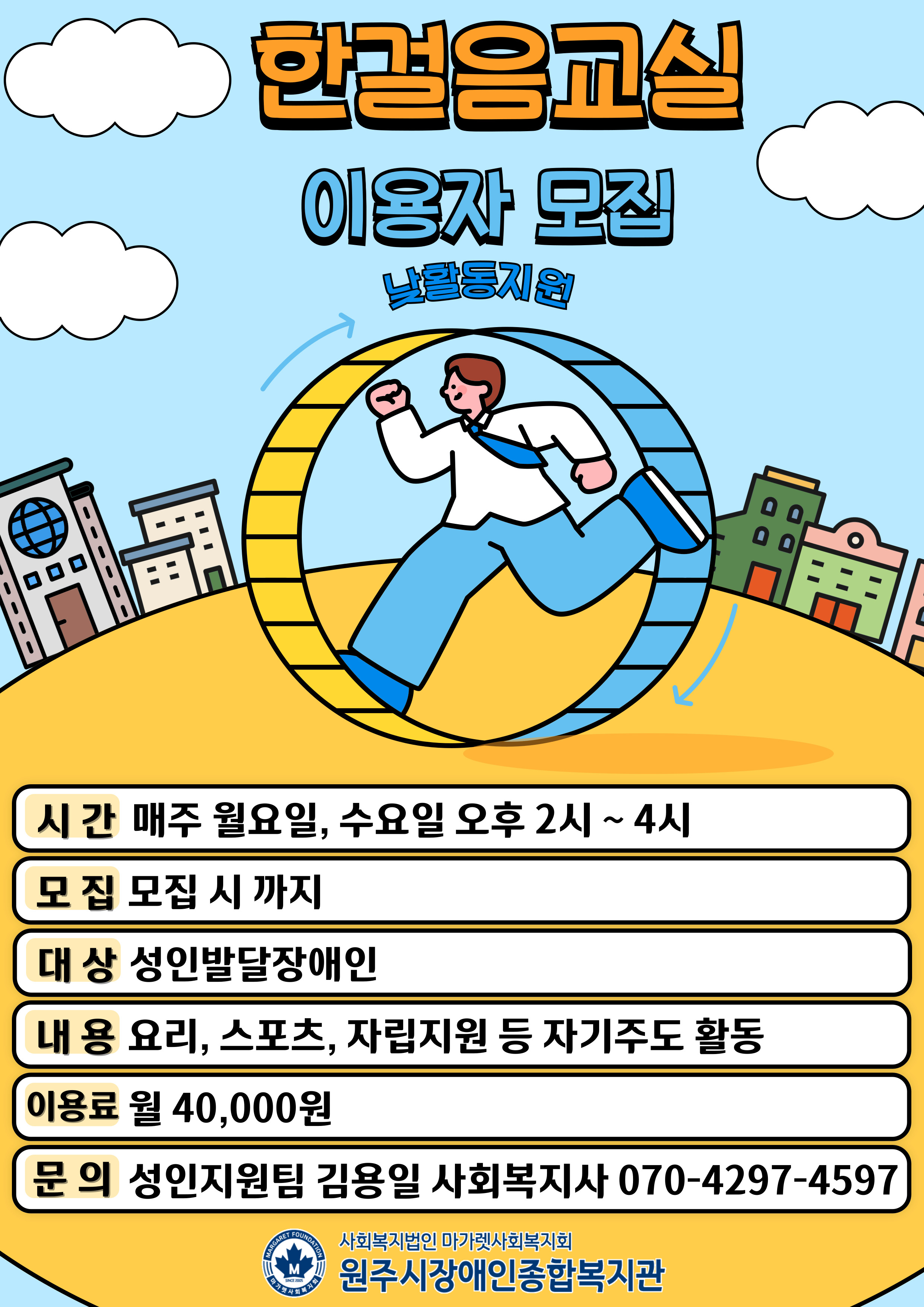 원주시장애인종합복지관(관장 정진애)은 성인 발달장애인으로 대상으로 진행하는 한걸음교실의 이용자를 모집한다. 한걸음교실은 발달장애인의 일상생활 활동의 확대와 자기주도적인 삶을 영위하기 위해 진행되며, 신체활동, 사회적응훈련, 일상생활훈련 뿐만 아니라 이용자들이 스스로 결정하는 자기주도 활동도 진행된다. ...
