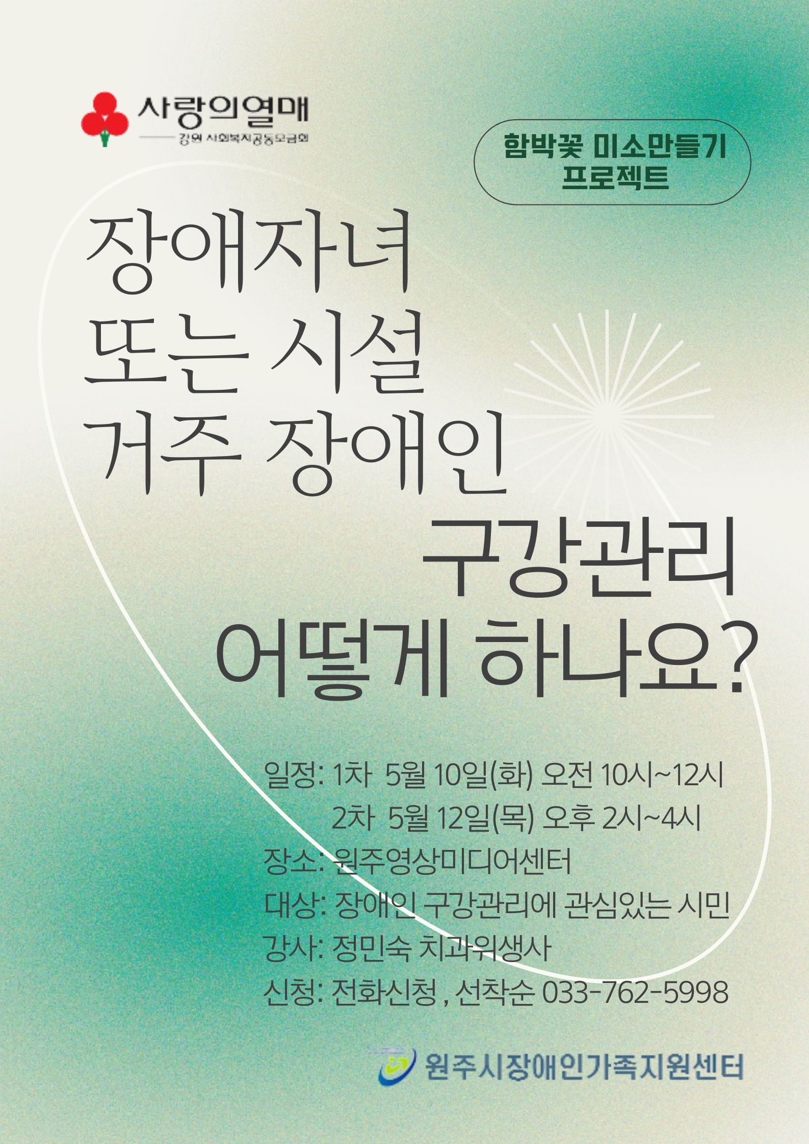 [강원사회복지신문 서은진 기자]=원주시장애인가족지원센터는 2022년 사회복지공동모금회 지원을 통해 장애인들의 건강 삶을 유지하실 수 있도록 장애인방문구강관리 활동 '함박꽃 미소 만들기 프로젝트'를 진행한다. 재가 장애인 대상 개별 구강관리 교육을 진행한다. 더불어 5월에는 장애인 가족 및 기관 종사자를 대상으로...