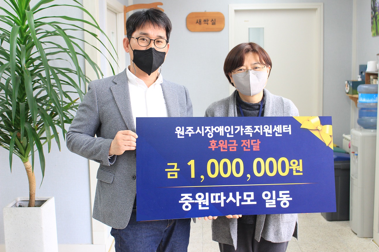 [강원사회복지신문 서은진 기자]=원주시장애인가족지원센터(센터장 이현귀)가 지난 3월 15일(화) 원주지역 봉사단체인 '중원 따.사.모(따뜻한 사람들의 모임, 회장 박성욱)로부터 노후된 컴퓨터 및 사무기기 교체 기금 100만원을 후원받았다. '따사모'는 원주지역 독지가들로 결성된 모임으로, 2000년 이후 원주지역에서 장학...