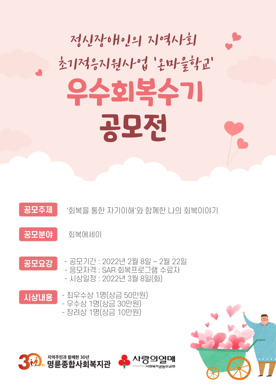 [강원사회복지신문 서은진 기자]=명륜종합사회복지관 정신장애인 지역사회 초기적응 지원사업 '온마을학교'는 오는 3월 8일까지 '우수회복수기 공모전'을 추진한다. 이번 공모전은 '회복을 위한 자기이해 프로그램'에 참여한 지역사회 정신질환 당사자의 자아존중감을 향상하고, 회원 수기를 통해 지역사회 정신장애인의 긍정...