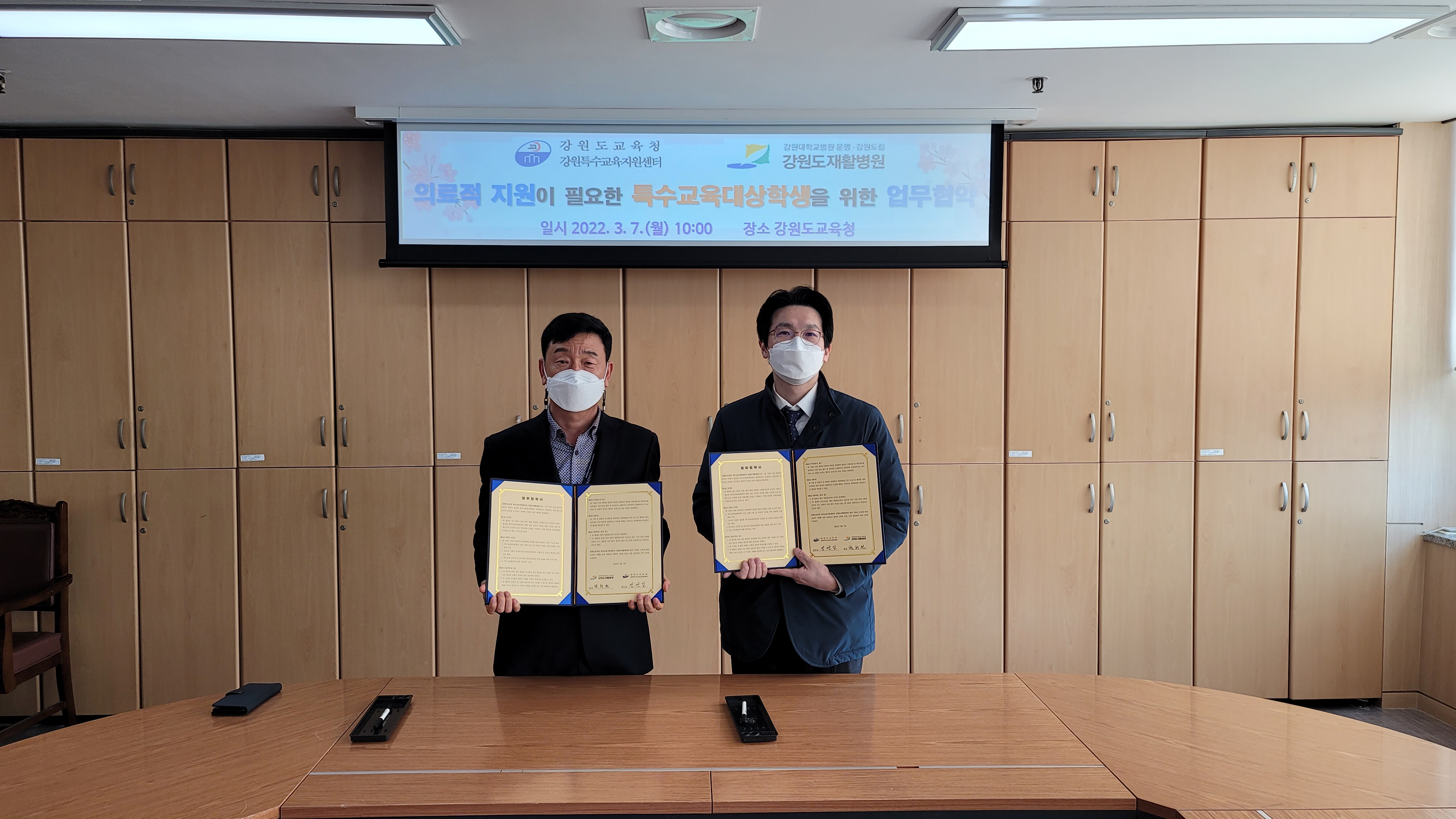[강원사회복지신문 서은진 기자]=강원특수교육지원센터-강원도재활병원, 동해한마음병원 업무협약 체결 강원특수교육지원센터는 지난 3월 7일(월), 강원도재활병원과 '의료적지원이 필요한 특수교육대상학생'을 위한 업무협약을 체결했다. 의료적 지원은 학교에서 중도중복장애학생의 교육을 효율적으로 실시하기 위해 가래흡...