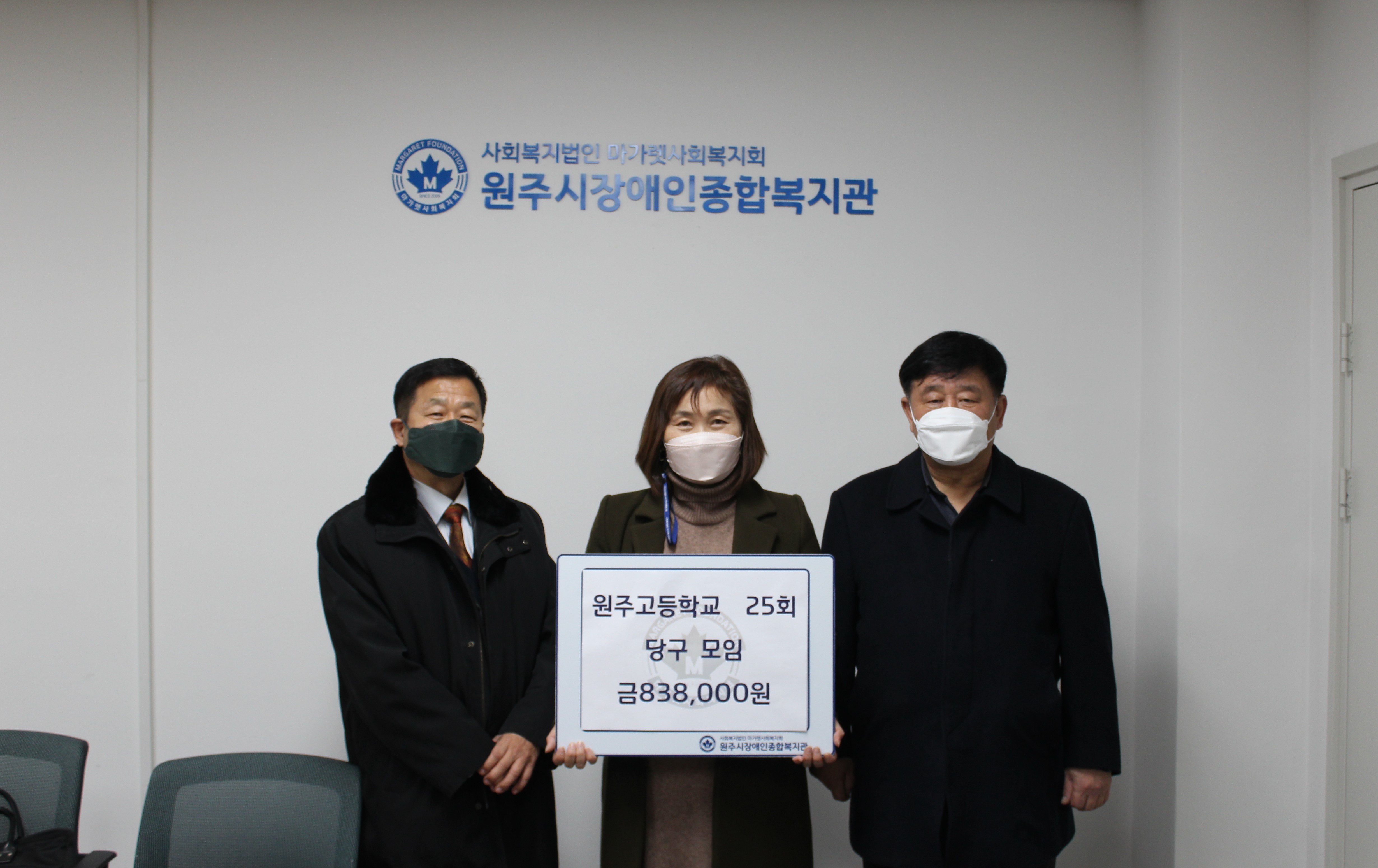 [강원사회복지신문 최재석 기자]=원주고등학교 25회 당구모임(회장 김창일)은 지난 12월 19일 원주시장애인종합복지관(관장 정진애)에 방문하여 후원금 83만8천원을 전달하였다. 김창일 회장은 "코로나19로 모두가 힘든 상황이지만, 더욱 어려움을 겪고 있는 지역사회의 이웃에게 작은 보탬이 되길 바라는 마음으로 후원금을...