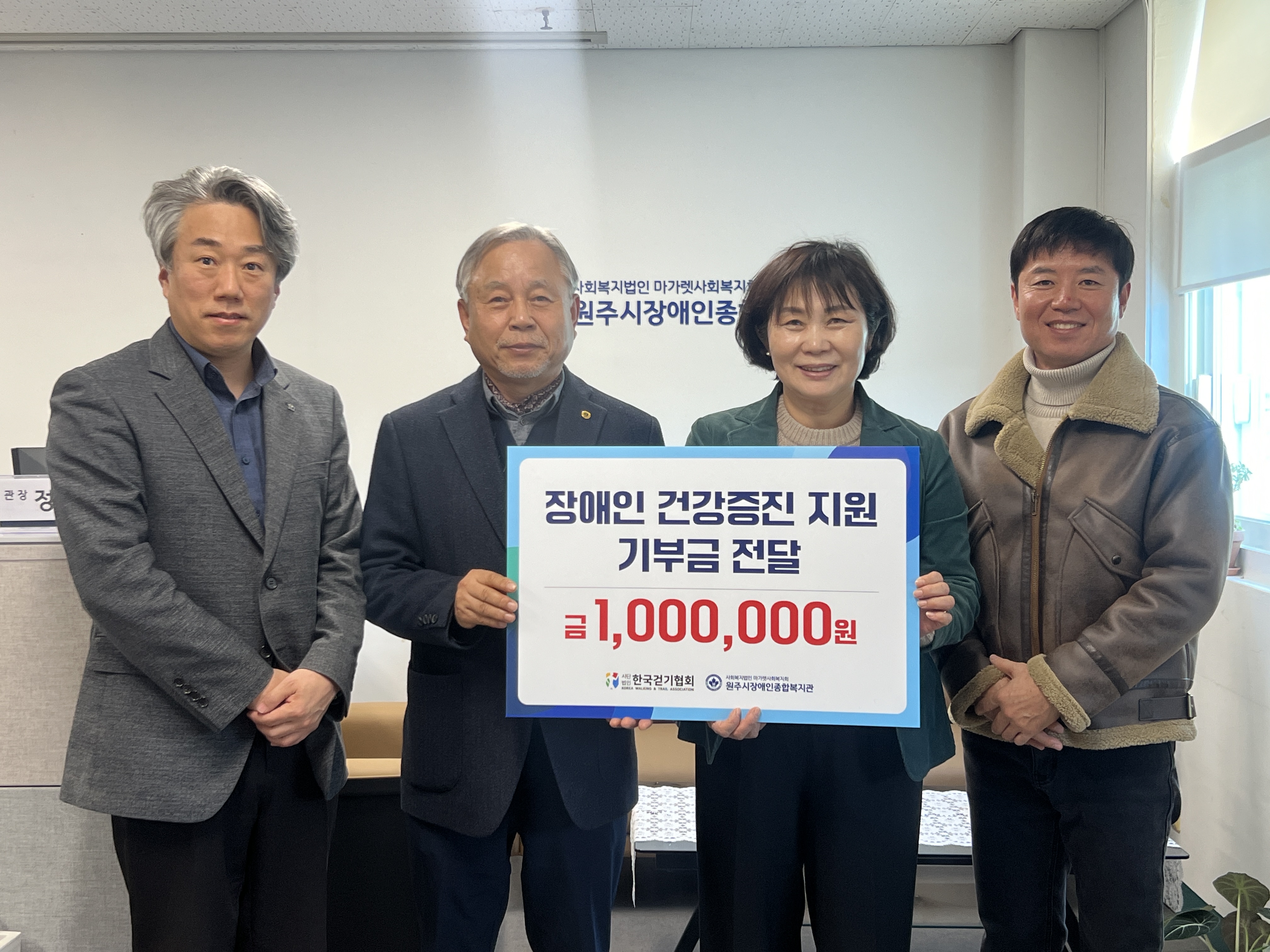 1월 9일(목), 사단법인 한국걷기협회(회장 김인호)에서는 원주시장애인종합복지관(관장 정진애)에 장애인 건강증진 지원 기부금 100만원을 전달했다. 원주시장애인종합복지관에서는 해당 기부금을 올해 4월 중 장애인식개선 걷기대회에 사용할 예정이며, 이 행사는 장애인과 비장애인 250여명이 참가하는 대규모 행사로 매년...