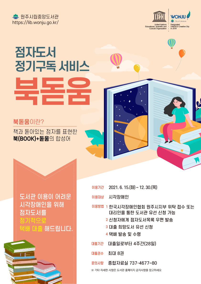시각장애인 대상 점자도서 무료 택배 대출 [강원사회복지신문 서은진 기자]=원주시립중앙도서관은 6월 15일부터 도서관 이용이 어려운 시각장애인에게 점자도서를 택배로 대출해주는 '북돋움' 점자도서 정기구독 서비스를 시행한다. 북돋움이란 책과 돋아있는 점자를 표현한 '북(BOOK)+돋움'의 합성어로, 시각장애인 이용자가...