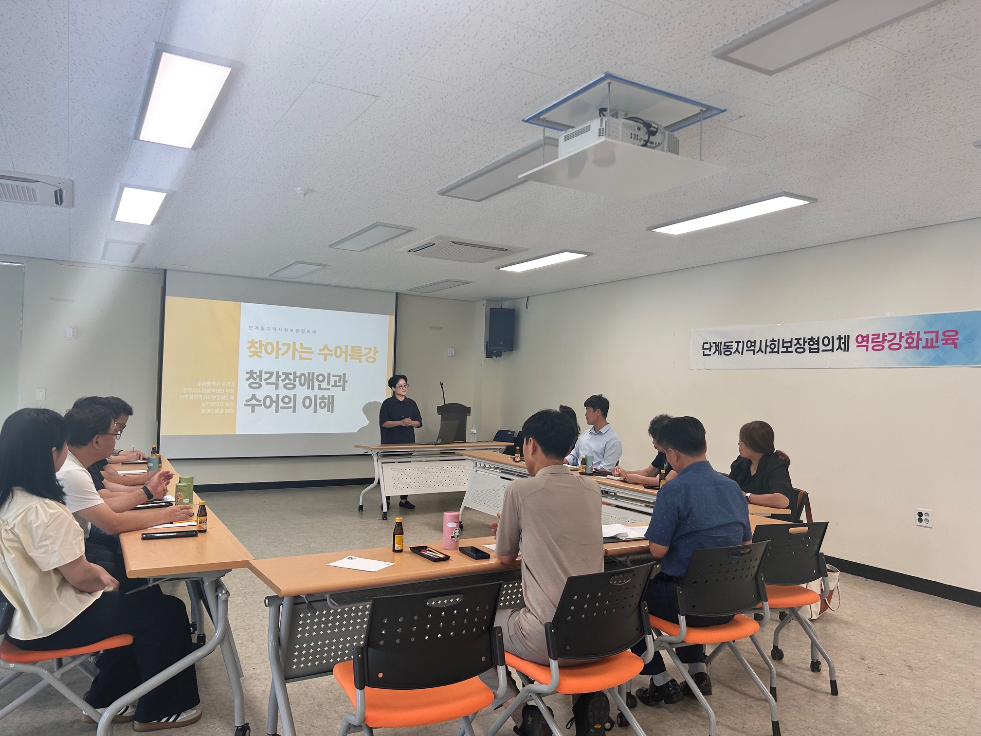 청각장애인에 대한 이해 및 수어 교육 원주시 단계동지역사회보장협의체(공공위원장 김주현, 민간위원장 김주백)는 지난 8월 22일(목) 단계동 행정복지센터 2층 대회의실에서 협의체 위원 대상 역량강화 교육을 진행했다. 이번 교육은 원주시수어통역센터 유경미 부장이 진행하였으며, 청각장애인의 특성 및 수어에 대한 설명...