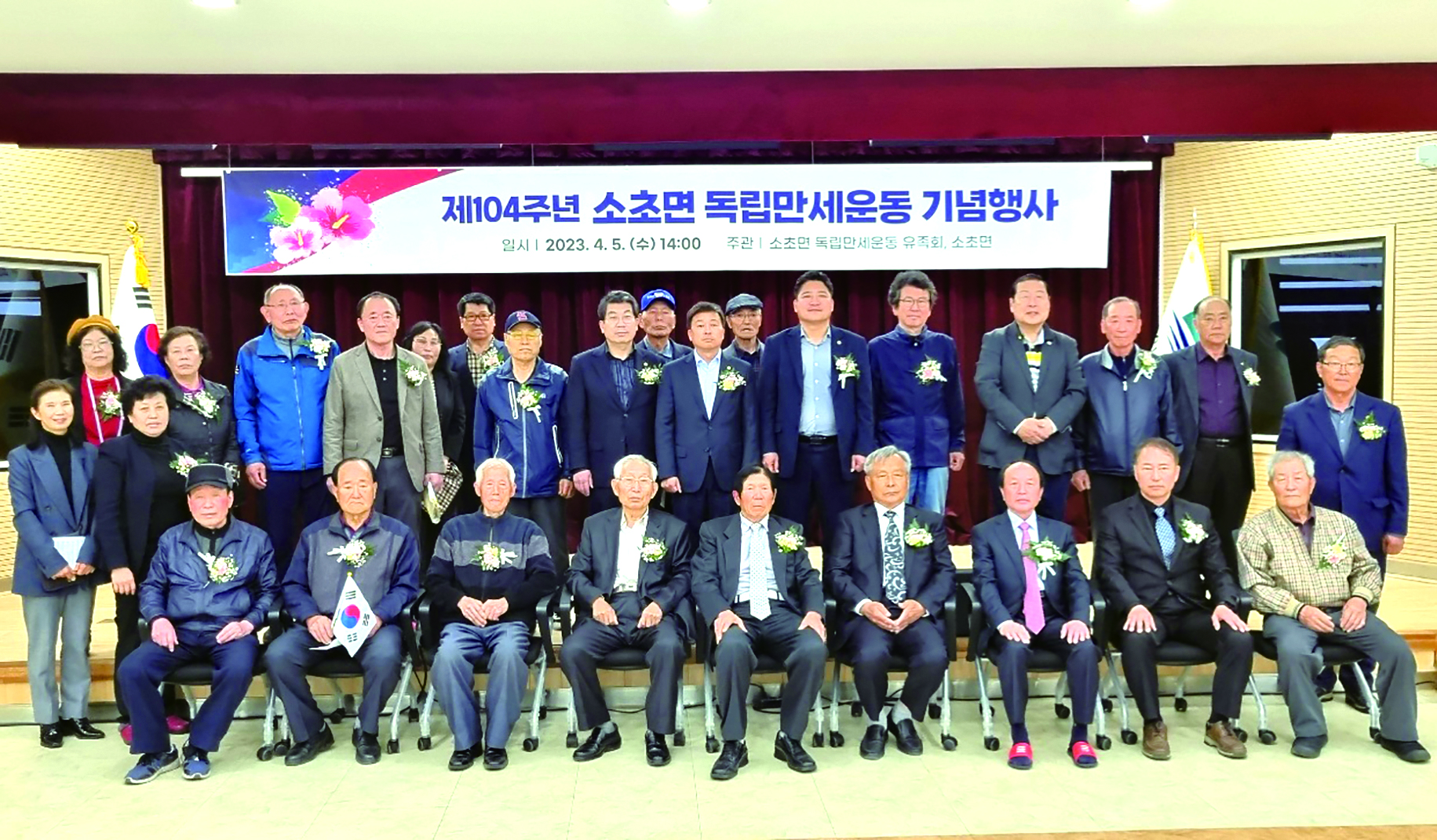[강원사회복지신문 서은진 기자]=올해로 104주년을 맞이하는 소초면 독립만세운동 기념행사가 소초면과 소초면 독립만세운동 유족회(회장 이종은) 주관으로 지난 4월 5일 소초면 행정복지센터 내 독립만세운동 기념비 앞마당에서 열렸다. 코로나19로 인해 4년 만에 열린 이번 행사에는 유족회 및 지역주민 100여 명이 참석했...