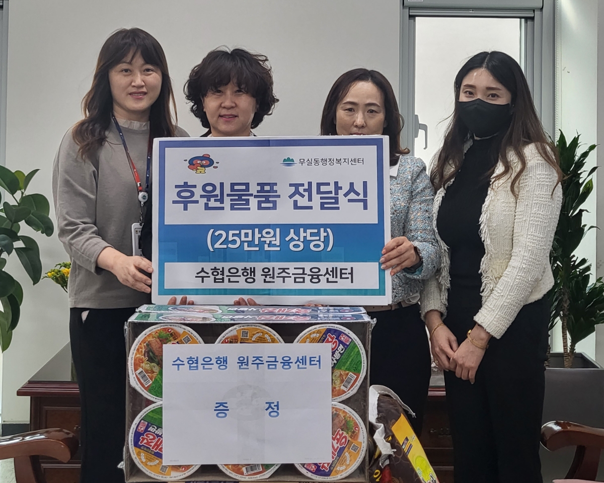 [강원사회복지신문 김도연 기자]=수협은행 원주금융센터는 지난 3월 15일 무실동 행정복지센터를 방문해 백미, 라면 등 25만 원 상당의 후원물품을 전달했다. 후원물품은 관내 소외계층 및 복지사각지대 가구에 전달될 예정이다.