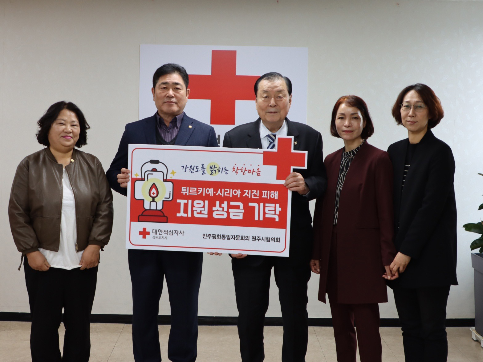 [강원사회복지신문 서은진 기자]=민주평화통일자문회의 원주시협의회(협의회장 선우영수)는 지난 3월 9일 강원적십자사(회장 이돈섭)에 튀르키예·시리아 지진 피해 성금 1백만 원을 전달했다. 한편, 민주평화통일자문회의는 헌법 제92조에 설치 근거를 둔 대통령 직속의 통일 자문기구로서 민주적 평화통일에 대한 정책의 수...