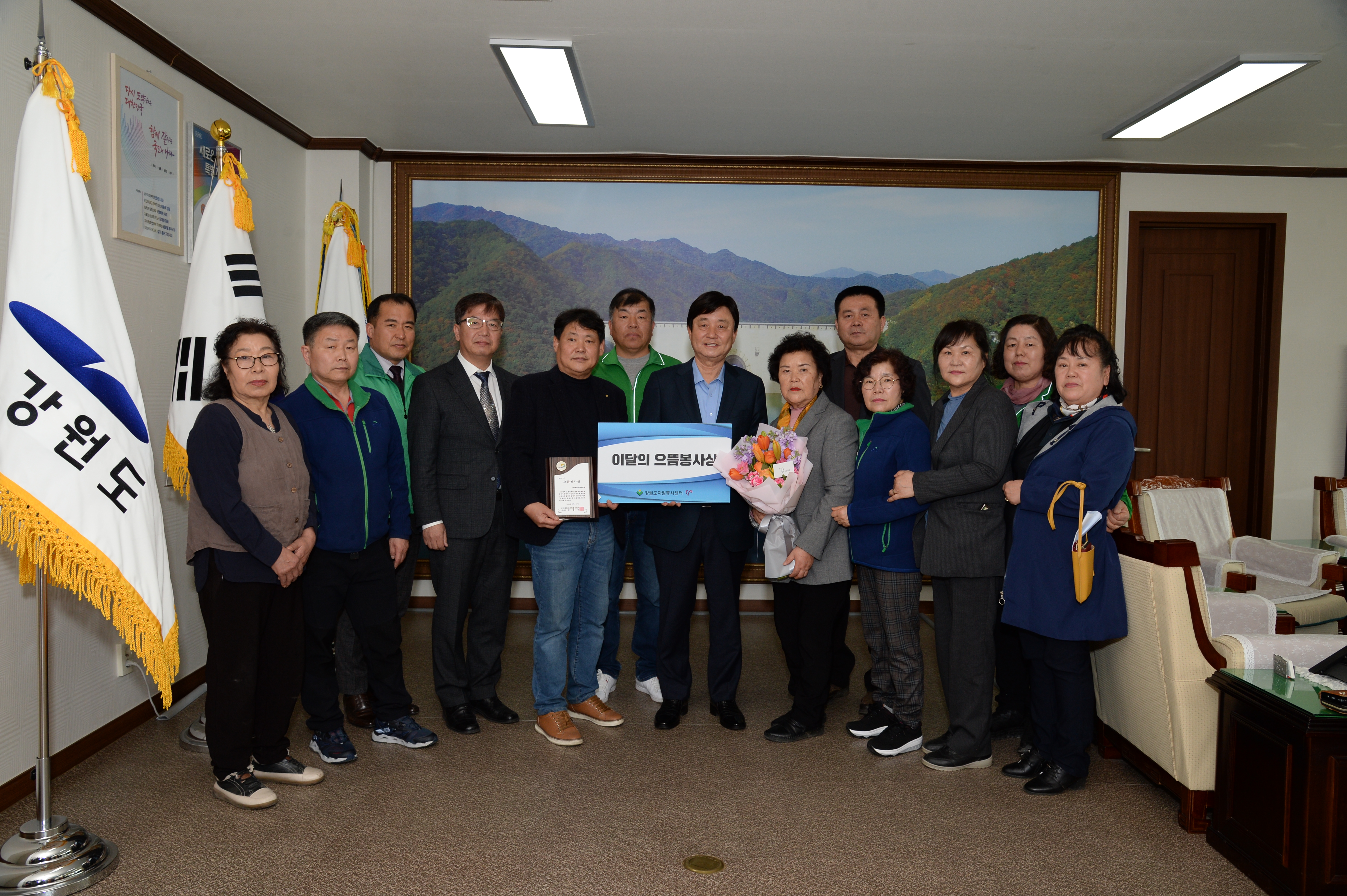 [강원사회복지신문 홍기한 기자]=강원도 자원봉사센터가 선정하는 '이 달의 으뜸 봉사상' 시상식이 지난 3월 9일 화천군청에서 최문순 군수, 수상단체장인 나병학 화천군 새마을회장, 이덕하 도자원봉사센터장, 김영수 화천군 자원봉사센터장 등이 참석한 가운데 열렸다.