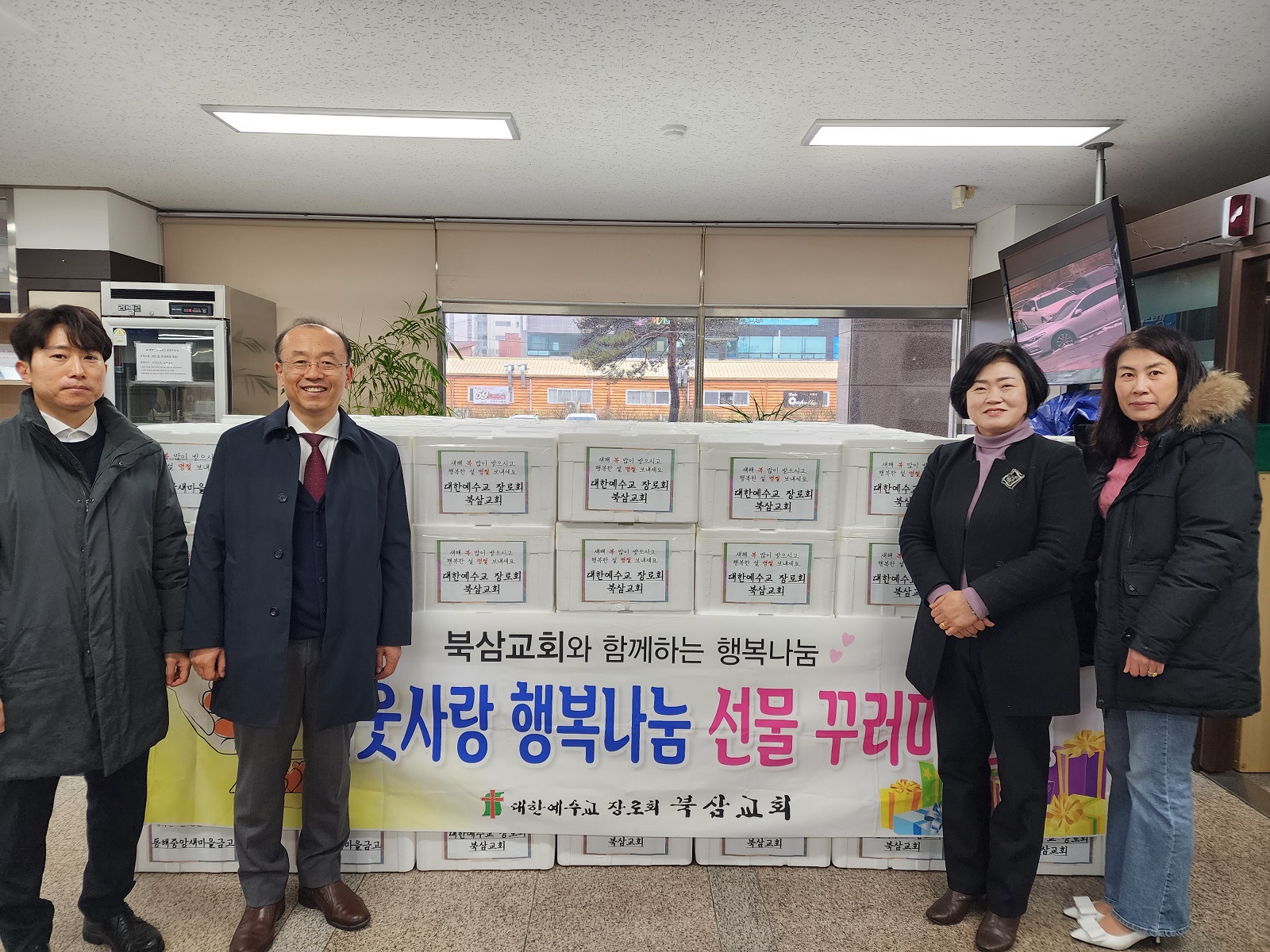 이번 설명절을 맞아 저소득 가구를 위해 대한예수교장로회 북삼교회(담임목사 박권규)는 지난 2월 5일 정성스럽게 준비한 밀가루, 참기름, 사골곰탕, 약과 등 생활용품 10종 넣은 꾸러미 상자 125개(5백만원 상당)를 기탁하였다.