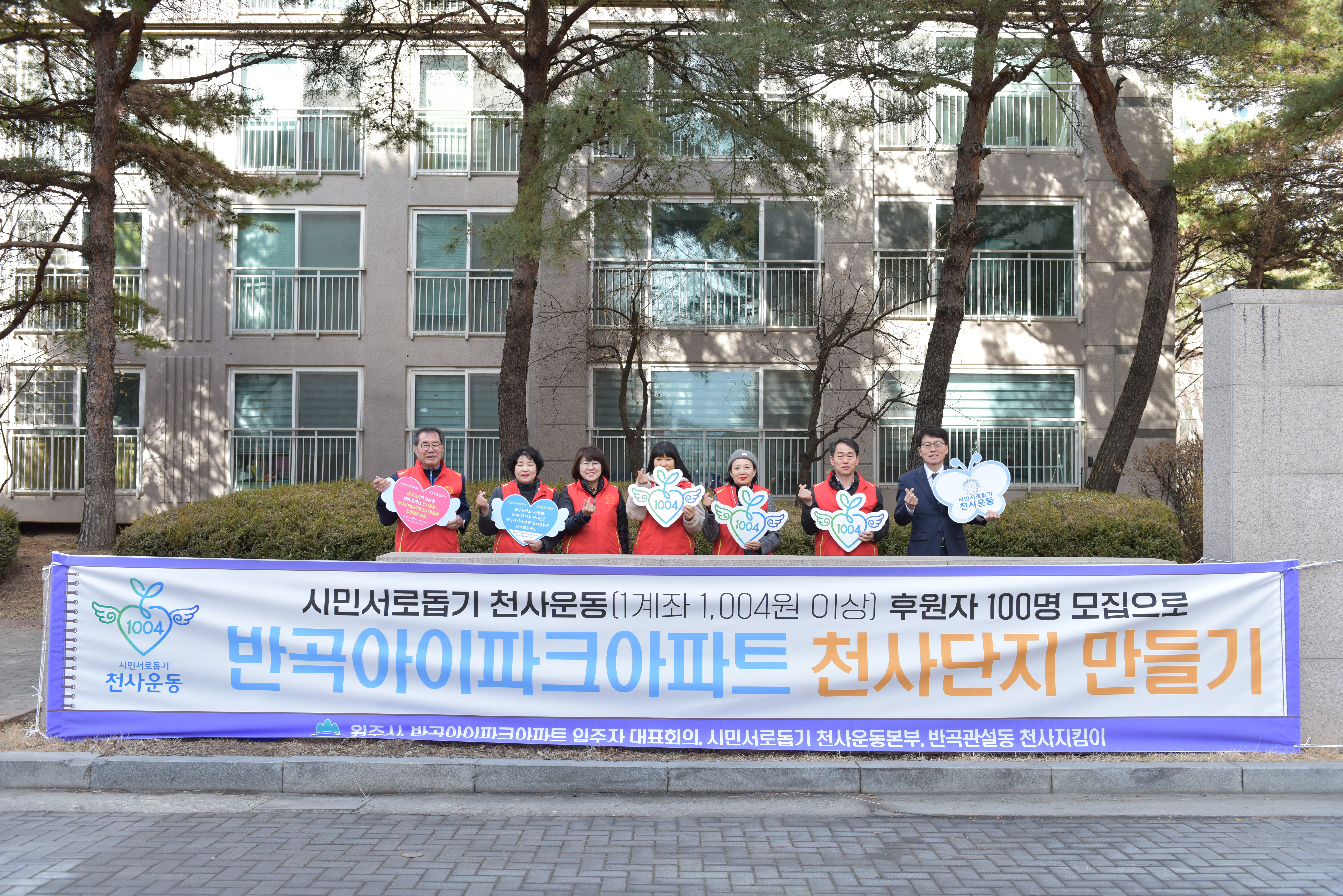 [강원사회복지신문 서은진 기자]=원주 반곡관설동에 위치한 아이파크아파트에서 시민서로돕기 천사운동 활성화 프로젝트인 '우리 아파트 천사단지 만들기'를 추진한다. 지난 3월 2일 아파트 정문 등에 천사운동 홍보 현수막을 게시하고 단지 내 홍보부스를 운영하며 천사아파트 만들기 활동을 시작했다. 이날 이성국 입주자 ...