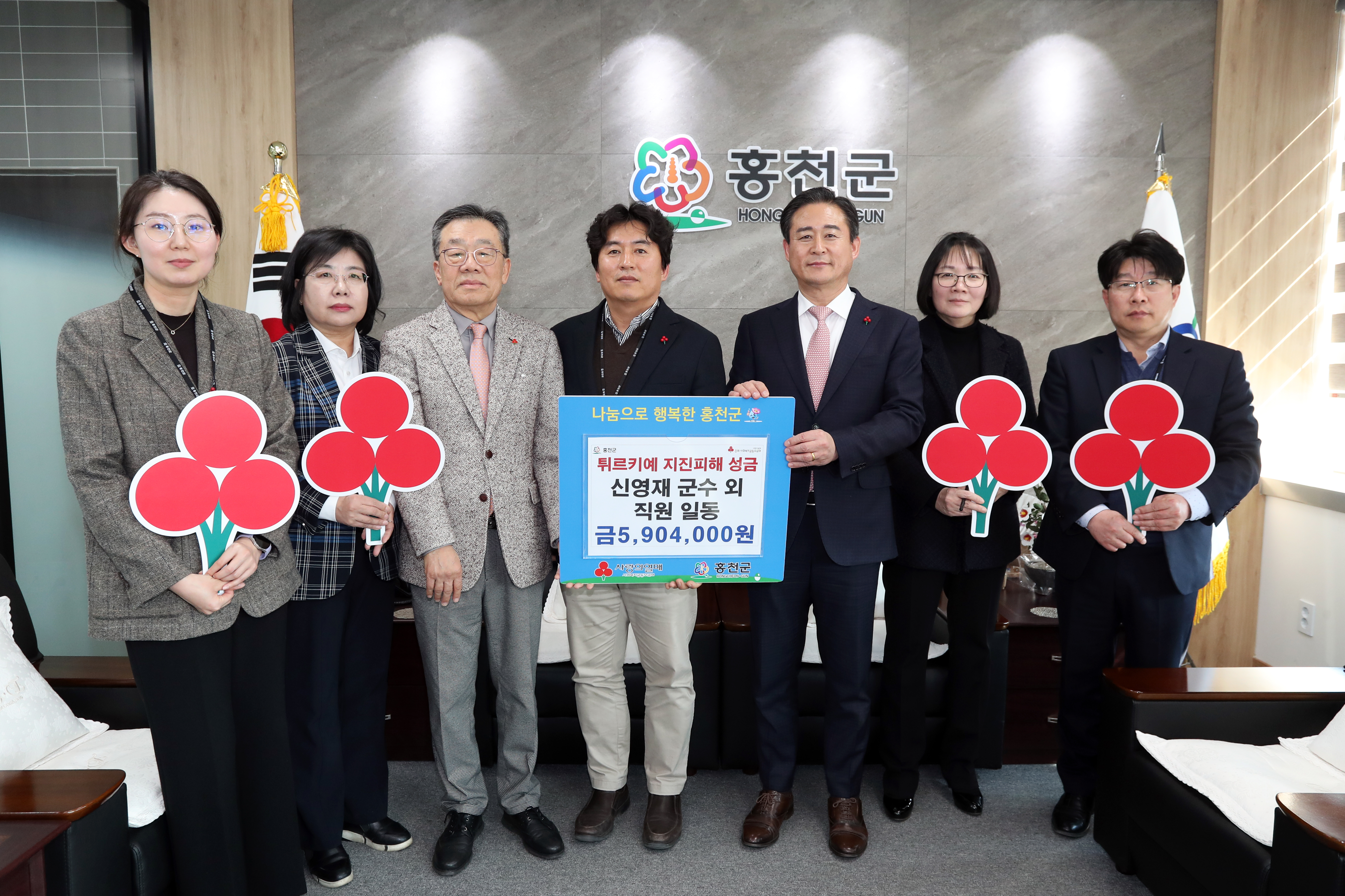 [강원사회복지신문 홍기한 기자]=홍천군은 지난 2월 28일 직원들이 자발적으로 모은 '2023년 튀르키예·시리아 지진 피해 지원 특별모금 캠페인' 성금 590만 4천원을 강원도 사회복지공동모금회에 전달했다. 신영재 홍천군수는 "갑작스러운 지진 피해로 어려움을 겪고 있는 튀르키예·시리아 이재민을 생각하며 직원들이 십시...