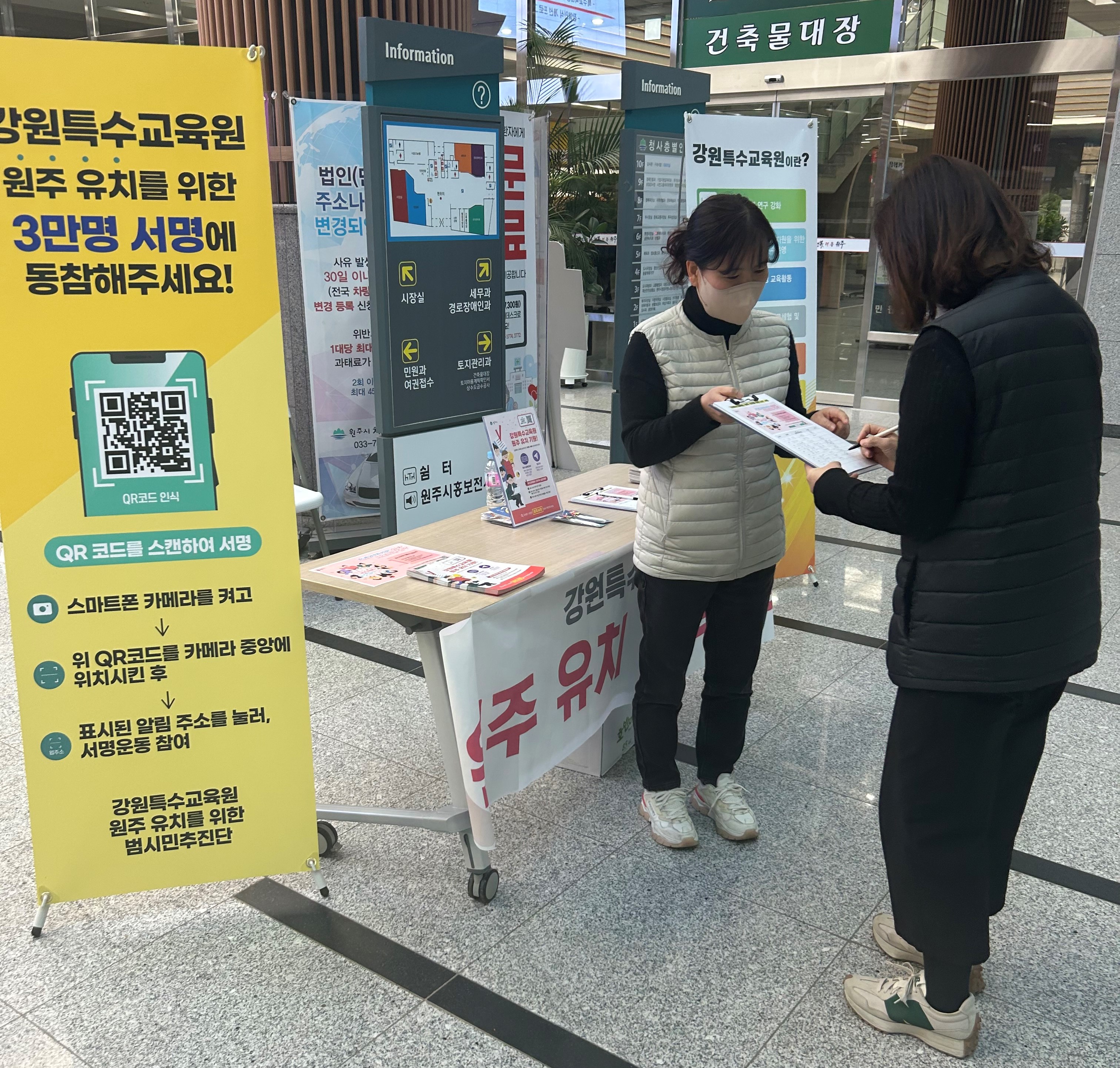 [강원사회복지신문 이정환 기자]=강원특수교육원 유치 열망 후끈! 2월 27일 최종 집계 서명부 강원도교육청 전달 예정 원주시가 강원특수교육원 원주 유치를 위해 작년 11월부터 시작된 범시민 서명운동을 중간 집계한 결과, 지난 2월 22일 기준 7만 3천 명을 넘어선 것으로 집계됐다. 강원특수교육원 설립 지역이 이달 말, ...