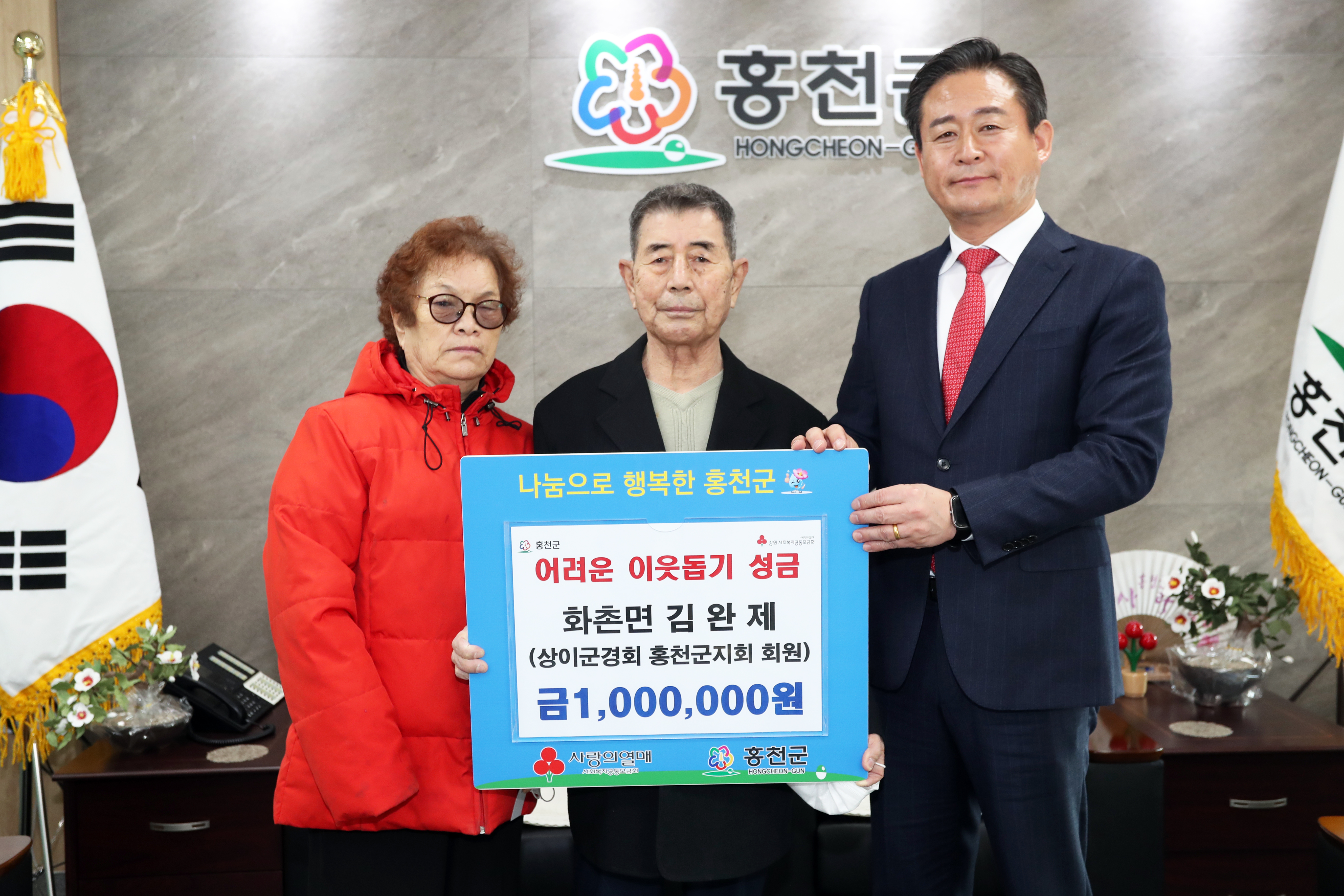 [강원사회복지신문 홍기한 기자]=대한민국상이군경회 홍천군지회 김완제 회원은 지난 2월 24일 군청을 방문해 이웃돕기 성금 100만원을 기탁했다. 화촌면에 거주하는 김완제씨는 매년 이웃돕기 성금을 기탁하는 등 주변의 어려운 이웃을 돕기 위한 나눔에 앞장서고 있다. 김완제씨는 "모두 어려운 시기이지만 후원을 통해 홍...