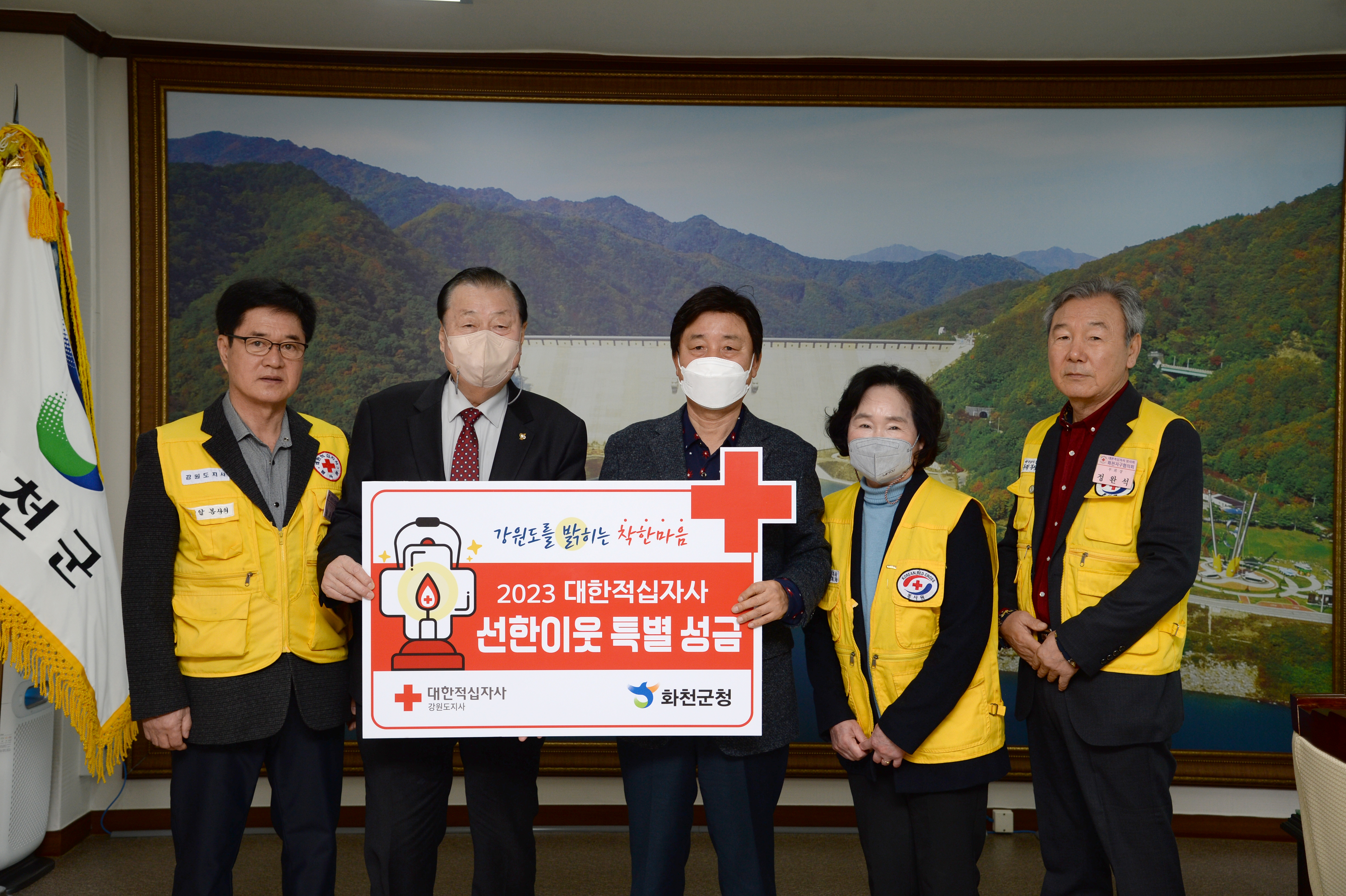 [강원사회복지신문 이정환 기자]=최문순 화천군수는 지난 2월 24일 화천군청 집무실에서 대한적십자사 강원도지사회(회장:이돈섭)에 2023년도 특별회비를 전달했다.