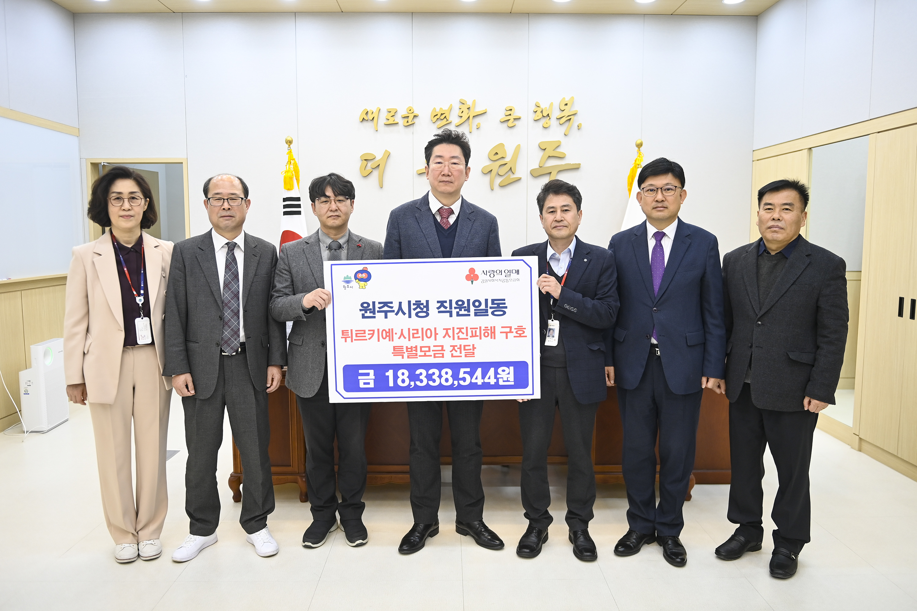 [강원사회복지신문 김도연 기자]=원주시청 직원들은 최근 지진 피해가 발생한 튀르키예와 시리아의 신속한 피해 복구를 위해 캠페인을 전개, 지진 구호성금 18,338,544원을 강원도공동모금회에 전달했다. 성금은 이재민을 위한 구호물자 자원과 피해지역 재건을 위해 사용될 예정이다. 원강수 원주시장은 "튀르키예는 지난 2...