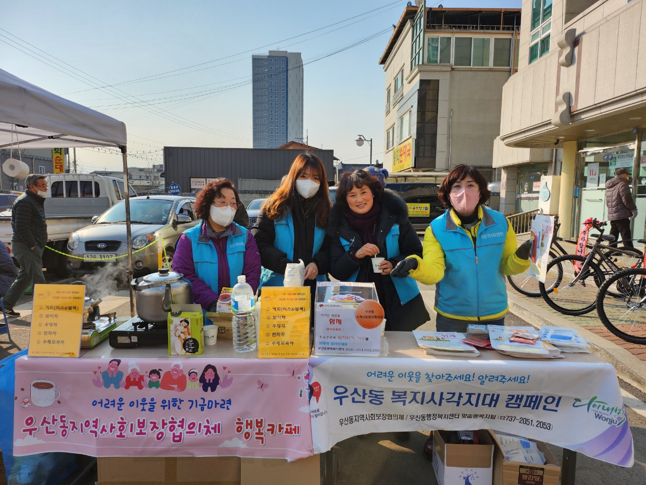 [강원사회복지신문 서은진 기자]=원주시 우산동지역사회보장협의체(공공위원장 박정희, 민간위원장 최인환)는 어려운 가구 지원을 위한 기금 마련을 위해 커피, 모과차 등을 판매하는 '행복카페'를 운영했다. 또한, 복지사각지대 발굴을 위해 안내문과 홍보 물품을 배부하며 어려운 이웃에 대한 관심과 제보를 부탁했다. 한편...