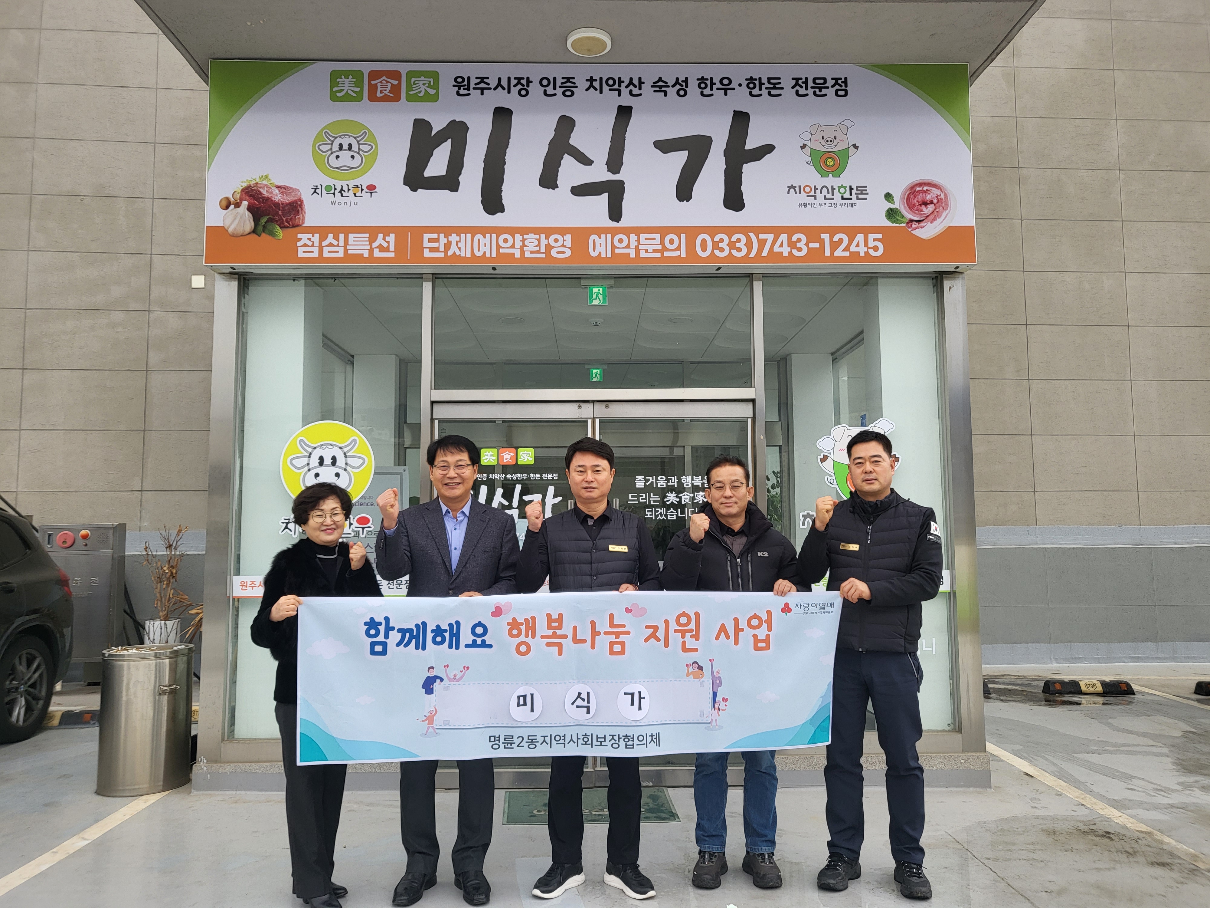 [강원사회복지신문 서은진 기자]=원주시 명륜2동 행정복지센터와 명륜2동지역사회보장협의체(위원장 권영숙)는 지난 2월 10일 반곡동 소재 미식가(대표 김용빈)와 자매결연 협약을 체결했다. 이번 협약으로 미식가는 저소득층 가구에 한우탕 100그릇을 전달하기로 했다. 또한, 김용빈 대표는 원주시나눔봉사단 명의로 현금 1...