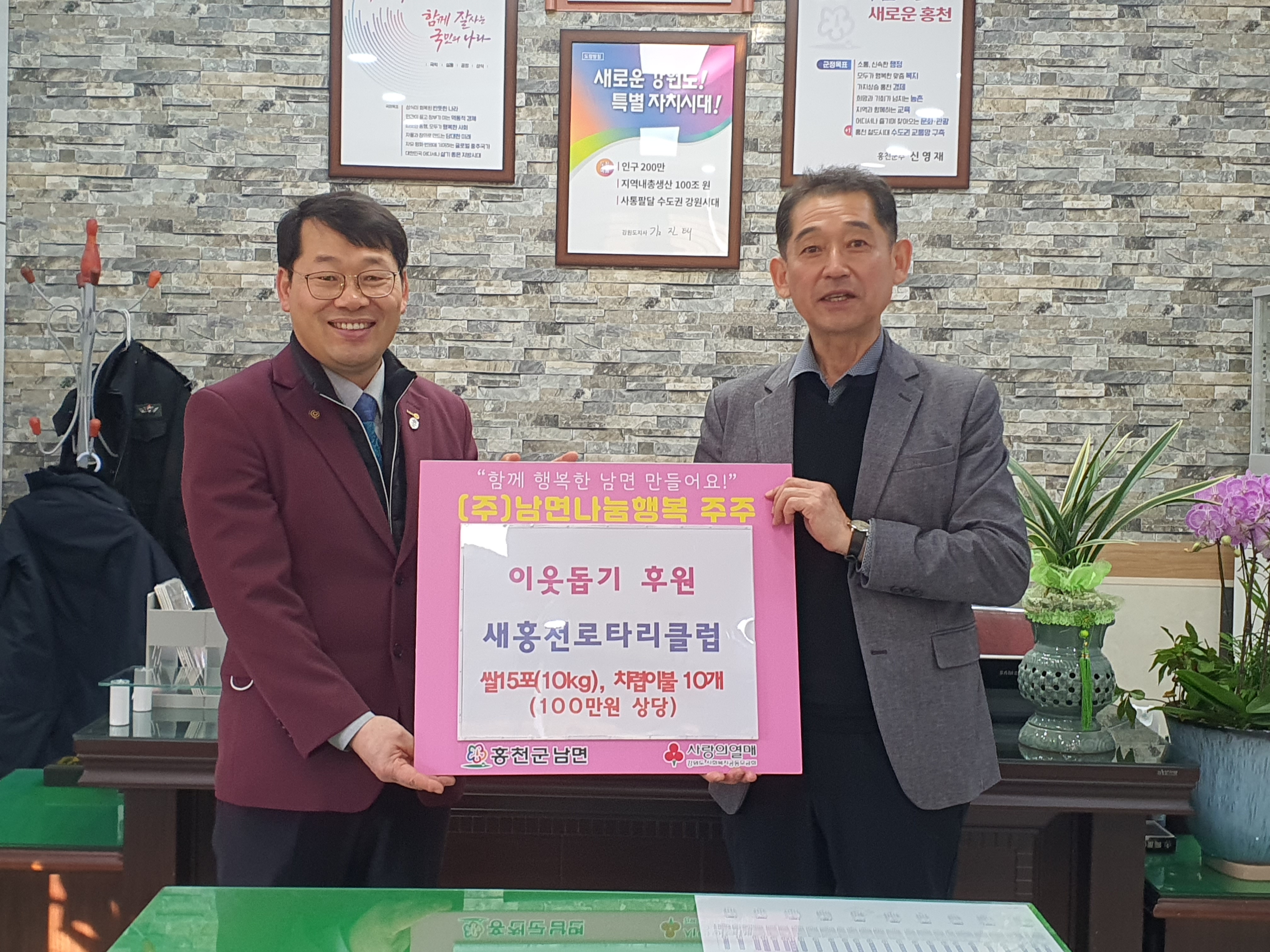 [강원사회복지신문 홍기한 기자]=새홍천로타리클럽(회장 박원근)은 지난 2월 9일 홍천군 남면행정복지센터를 방문해 100만원 상당의 쌀(10kg) 15포와 차렵이불 10채를 어려운 이웃돕기 후원물품으로 전달했다. 박원근 회장은 "남면에 어려운 분들을 위해 후원물품을 준비했다"며, "큰 도움은 아니지만 앞으로도 지속적으로 도...