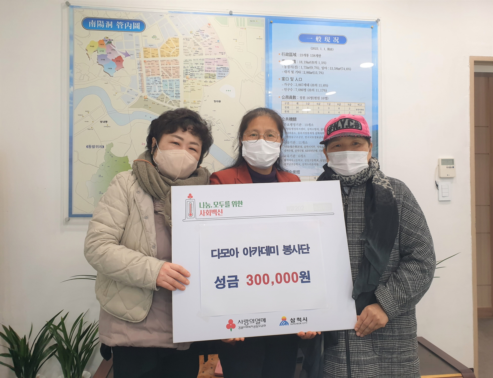 [강원사회복지신문 홍기한 기자]=삼척시 남양동 다모아 아카데미 봉사단(회장 김화자, 총무 김영미)은 지난 2월 8일(수) 삼척시 남양동행정복지센터를 방문하여 '2023년 정월대보름제 노래자랑' 상금 30만 원을 어려운 이웃을 위해 써달라며 이웃돕기성금으로 기탁했다.