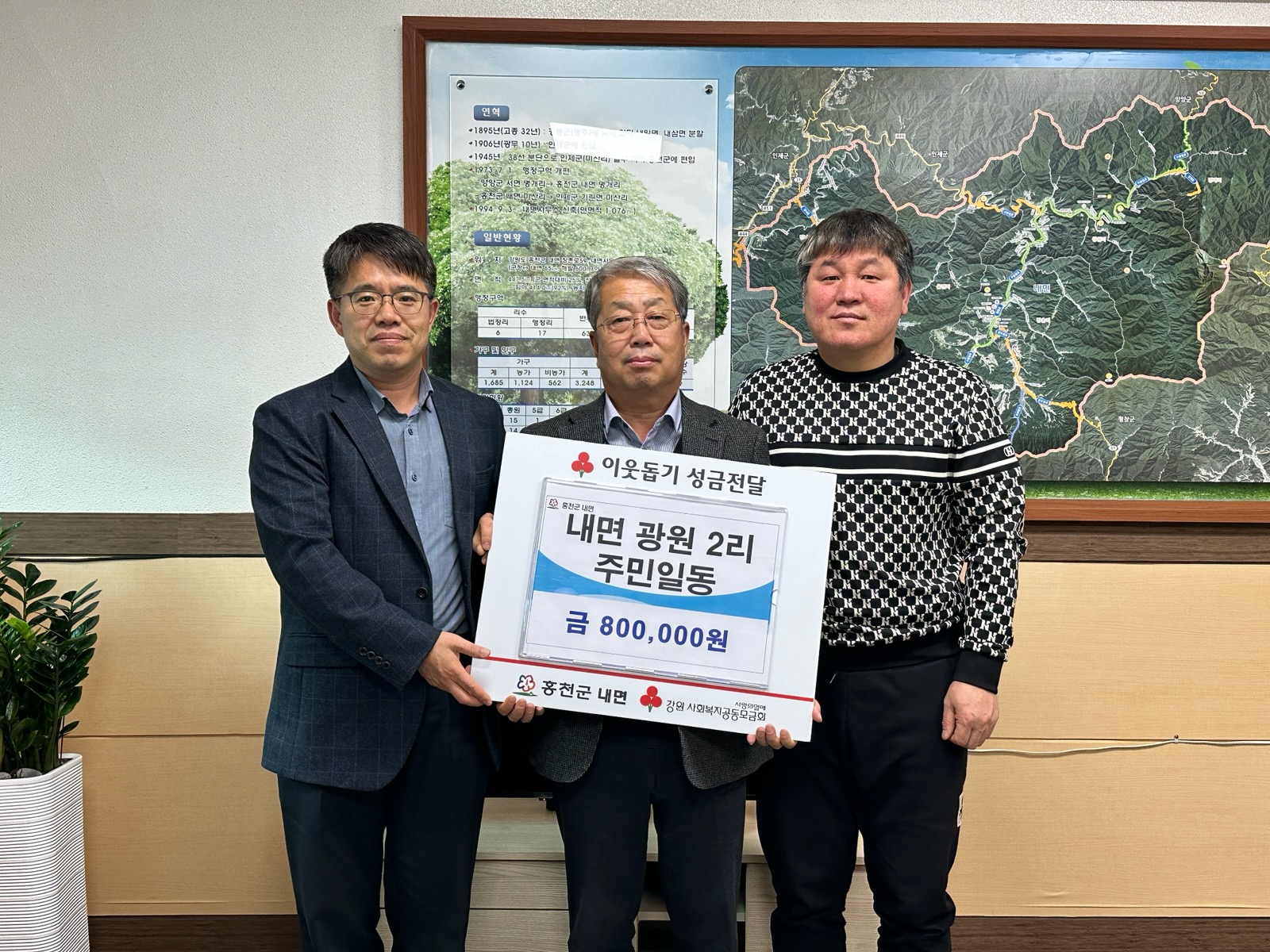 [강원사회복지신문 홍기한 기자]=홍천군 내면 광원2리 주민 일동(정시명 외 4인)은 지난 2월 2일 내면행정복지센터를 방문해 화재 피해가구를 위한 3번째 성금 80만원을 기탁했다. 김명근 광원2리 이장은 "광원2리 주민의 자발적 모금운동이 벌써 3번째까지 연결됐다"며, "삶을 절망에서 희망으로 바꾸는 일을 할 수 있어 기...