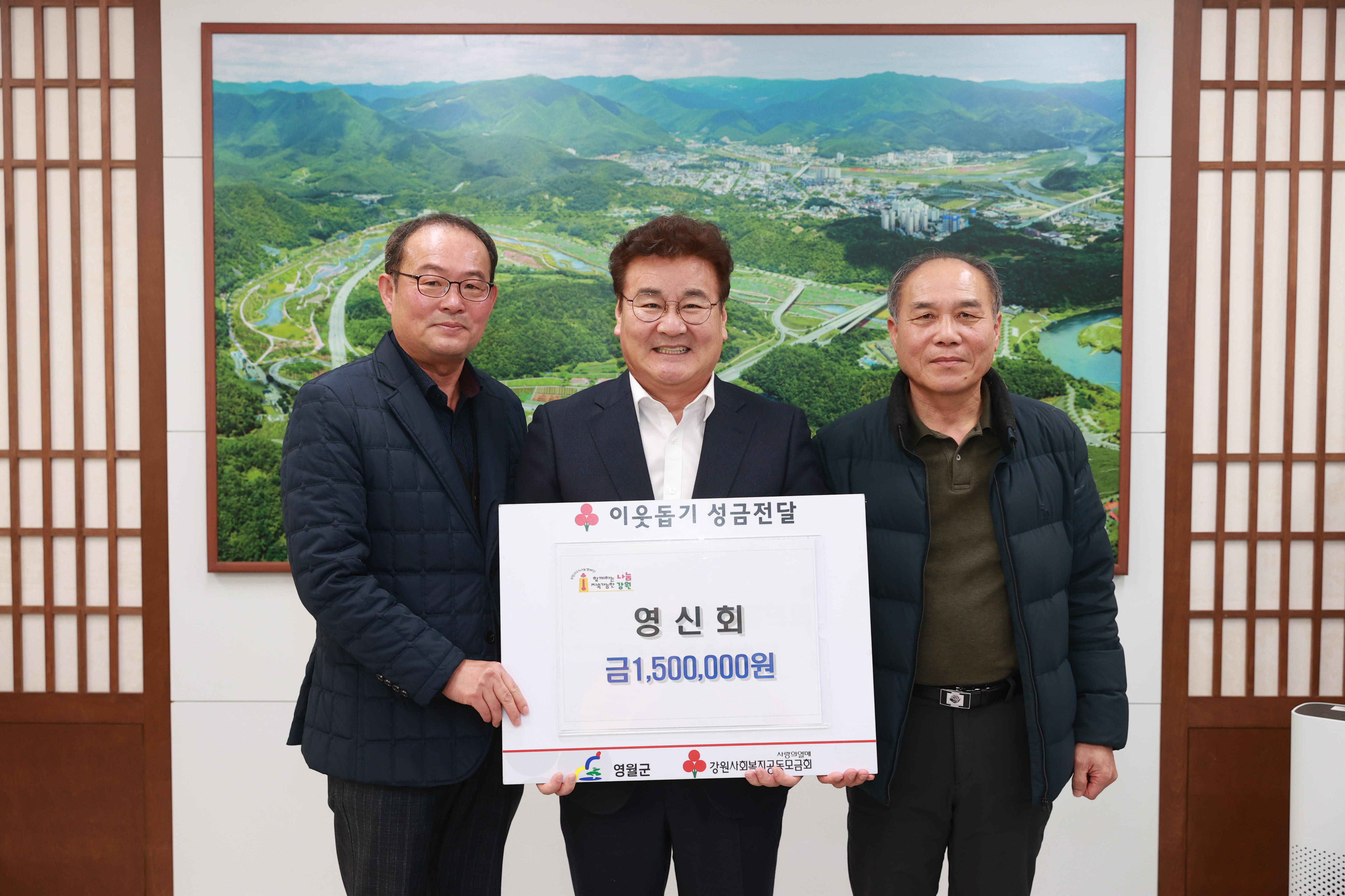 [강원사회복지신문 이정환 기자]=영월군 봉사단체인 이웃사랑 영신회(회장 서영석)는 지난 2월 2일 영월군청을 방문해 연말 이웃사랑 성금 150만원을 기탁했다. 서영석 회장은 "추운날씨에 어려움을 겪을 취약계층이 따뜻한 겨울을 보내는데 보탬이 되길 바란다."라고 전했다.