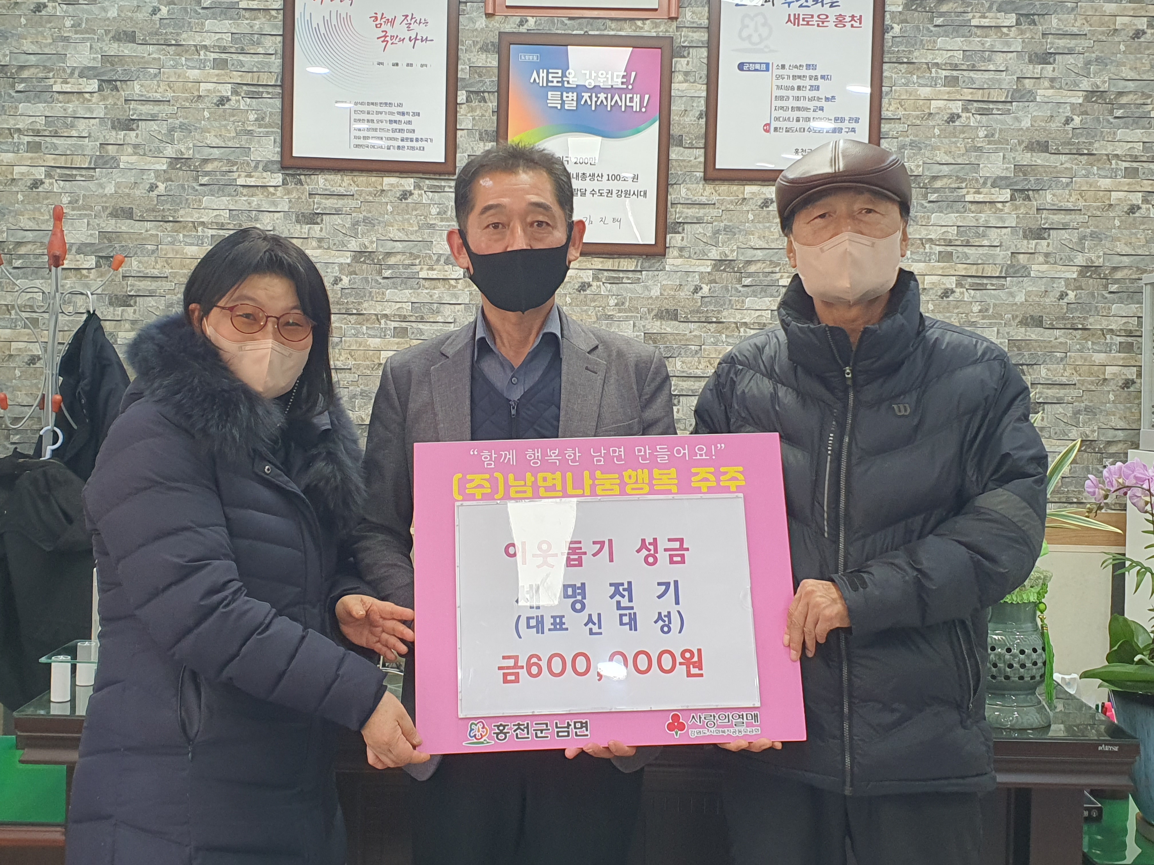 [강원사회복지신문 홍기한 기자]=세명전기(대표 신대성)는 지난 1월 27일 홍천군 남면행정복지센터를 방문해 어려운 이웃돕기 성금 60만원을 기탁했다.