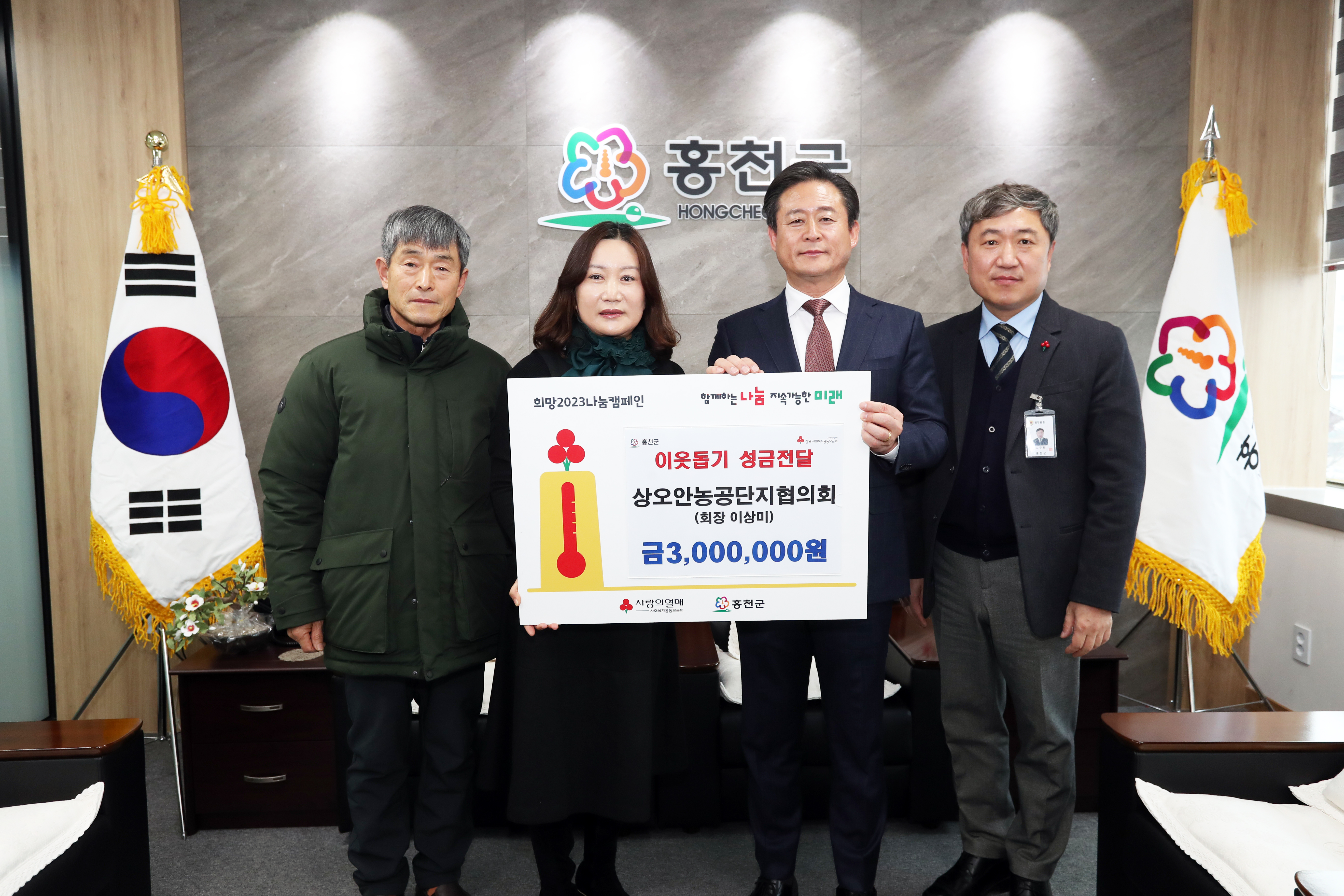 [강원사회복지신문 홍기한 기자]=홍천군 상오안농공단지협의회(회장 이상미)는 지난 1월 26일 홍천군청을 방문해 희망2023나눔캠페인 성금 300만원을 기탁했다. 이상미 회장은 "캠페인에 동참하게 되어 뜻깊게 생각한다"며, "앞으로도 나눔활동을 통해 기업의 사회적 책임을 실천하기 위해 노력하겠다"고 말했다. 한편 전달된...
