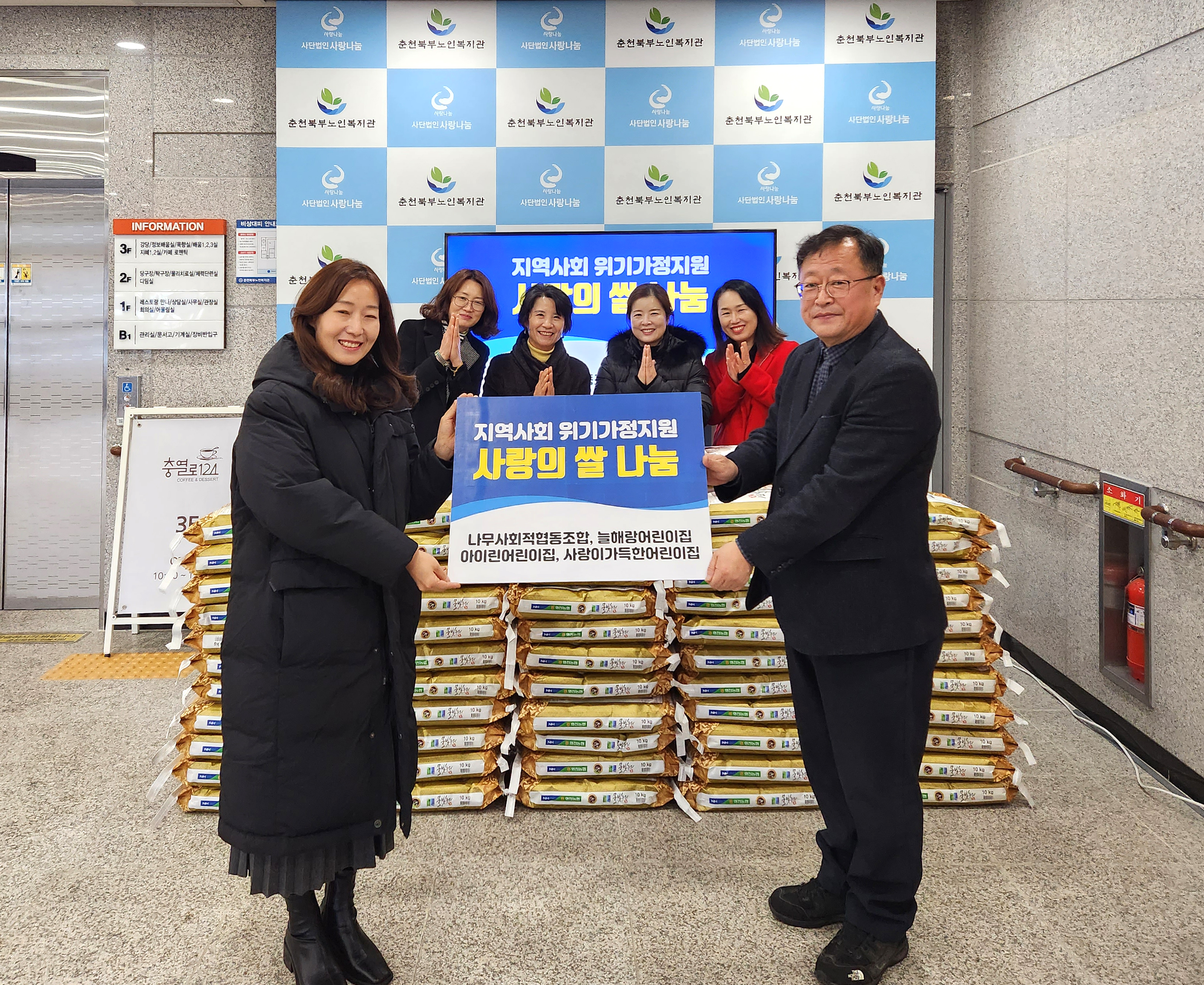 [강원사회복지신문 김도연 기자]=나무사회적협동조합(이사장 목련화)과 늘해랑어린이집(원장 백기범), 아이린어린이집(원장 이현정), 사랑이가득한어린이집(원장 김철순)이 사랑의 마음을 모아 지역사회 위기가정지원을 위해 쌀 70포를 춘천북부노인복지관(관장 박재호) 측에 전달했다. 전해주신 쌀은 지역사회 위기가정에 전...